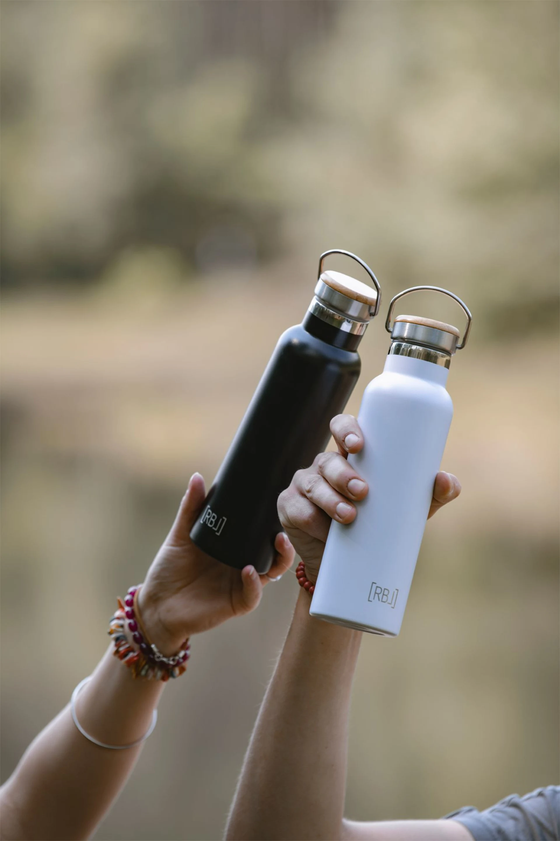 Doppelwandige Edelstahlisolierflasche mit Tragegriff und Schraubverschluss aus Bambus. Erhältlich in den Farben schwarz, lachsfarben, braun, weiß.