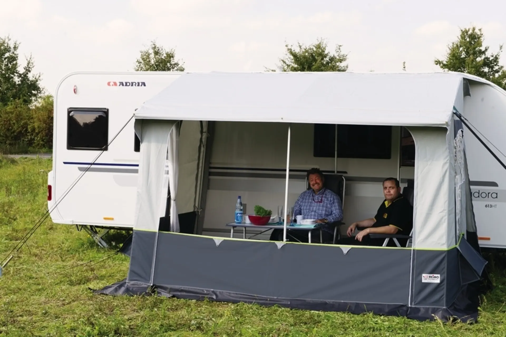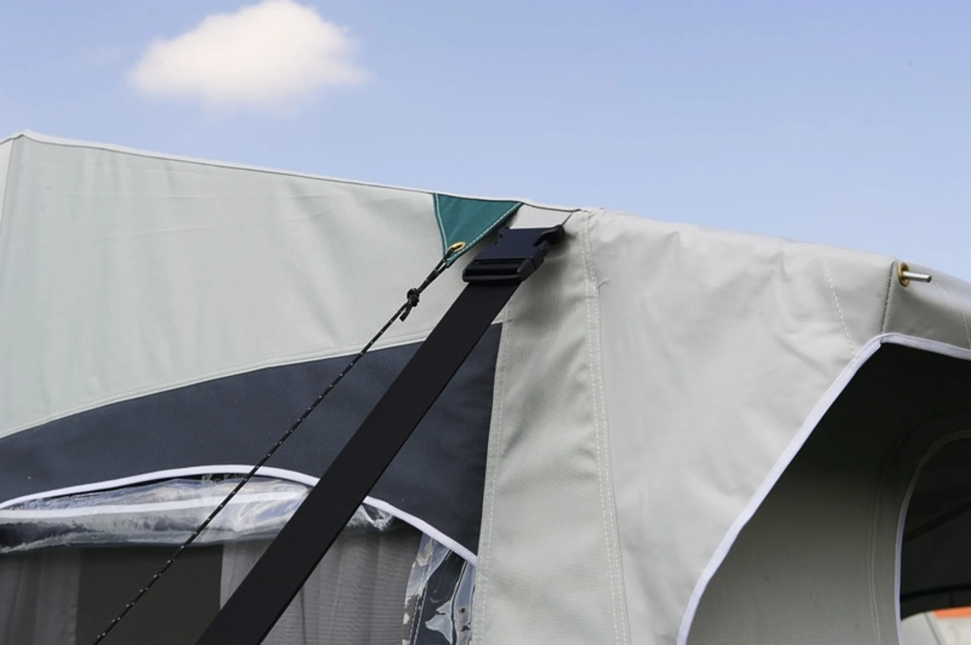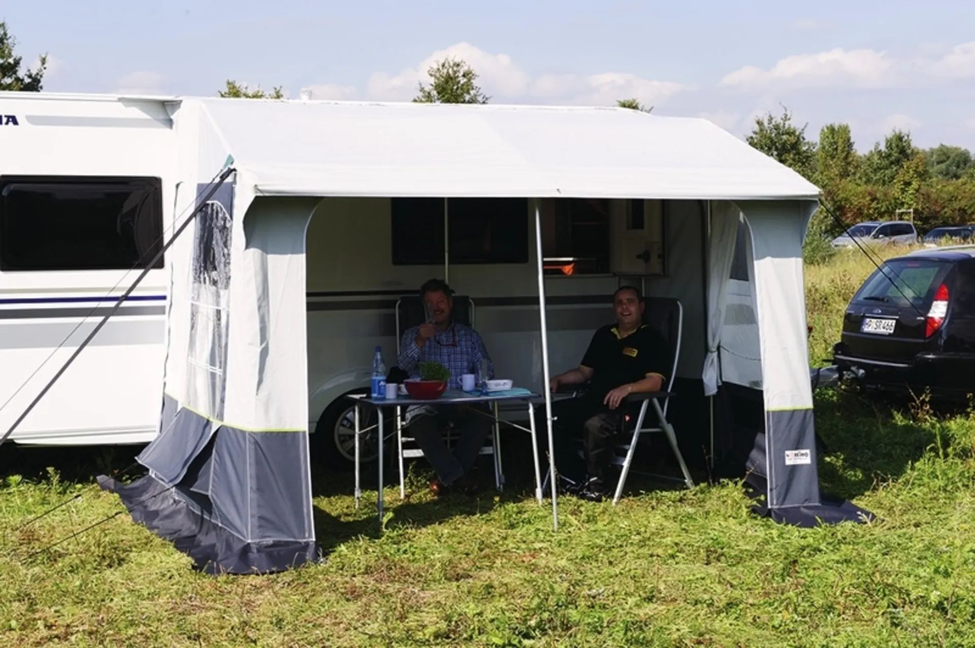Auf beiden Seiten verschließbarer Bodenlüfter sowie Zwangsbelüftung in der oberen Ecke. Abdichtung zum Caravan erfolgt mit Schaumwulst und gebogenen Anpress-Stangen.