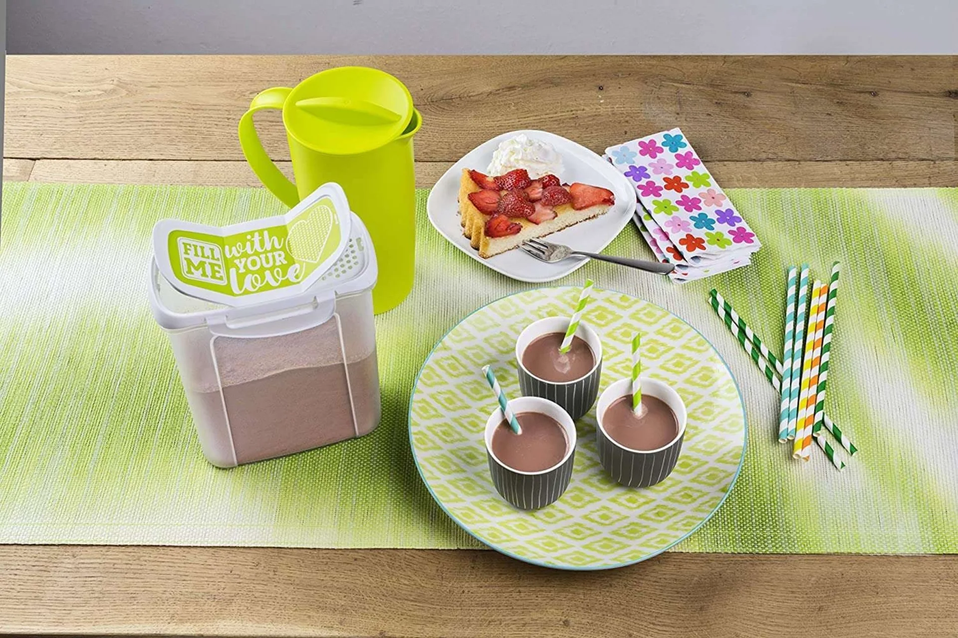 Der Krug Caruba hat ein Fassungsvermögen von 1.2 l und besteht aus unzerbrechlichem, lebensmittelechtem und schadstofffreiem Kunststoff - das robuste Material ist spülmaschinengeeignet und unempfindlich gegen Kratzer oder Verformungen. Die strukturierte Oberfläche sorgt für sicheren Halt selbst bei nassen Händen, der breite Henkel erleichtert das Ausgießen. Zum Transport oder zum Schutz gegen Insekten wird der Krug mit dem Deckel sicher verschlossen. Durch Drehen des Deckels können Sie zwischen 3 Funktionen wählen: offen, geschlossen sowie Ausguss mit Rechen. Leisten Sie sich einen praktischen Begleiter für Zuhause und unterwegs, an dem Sie lange Freude haben! Glück - das funktioniert auch ohne Scherben. Zum Beispiel mit den bruchsicheren Schüsseln, Tellern und Bechern der Linie Caruba, die sich ideal für ein entspanntes Picknick im Grünen oder eine sommerliche Grillparty eignen.