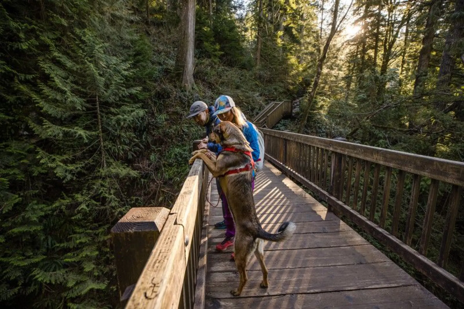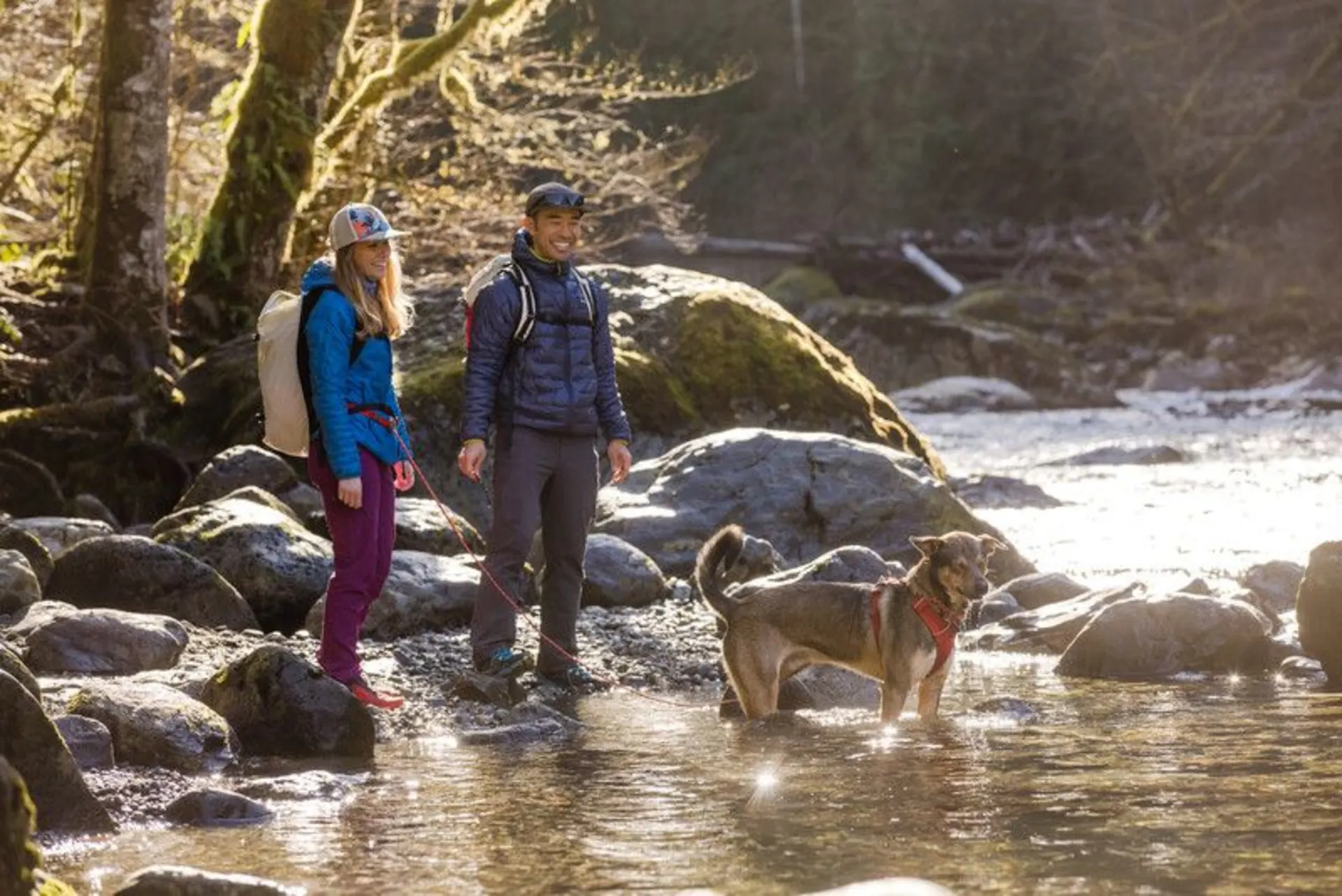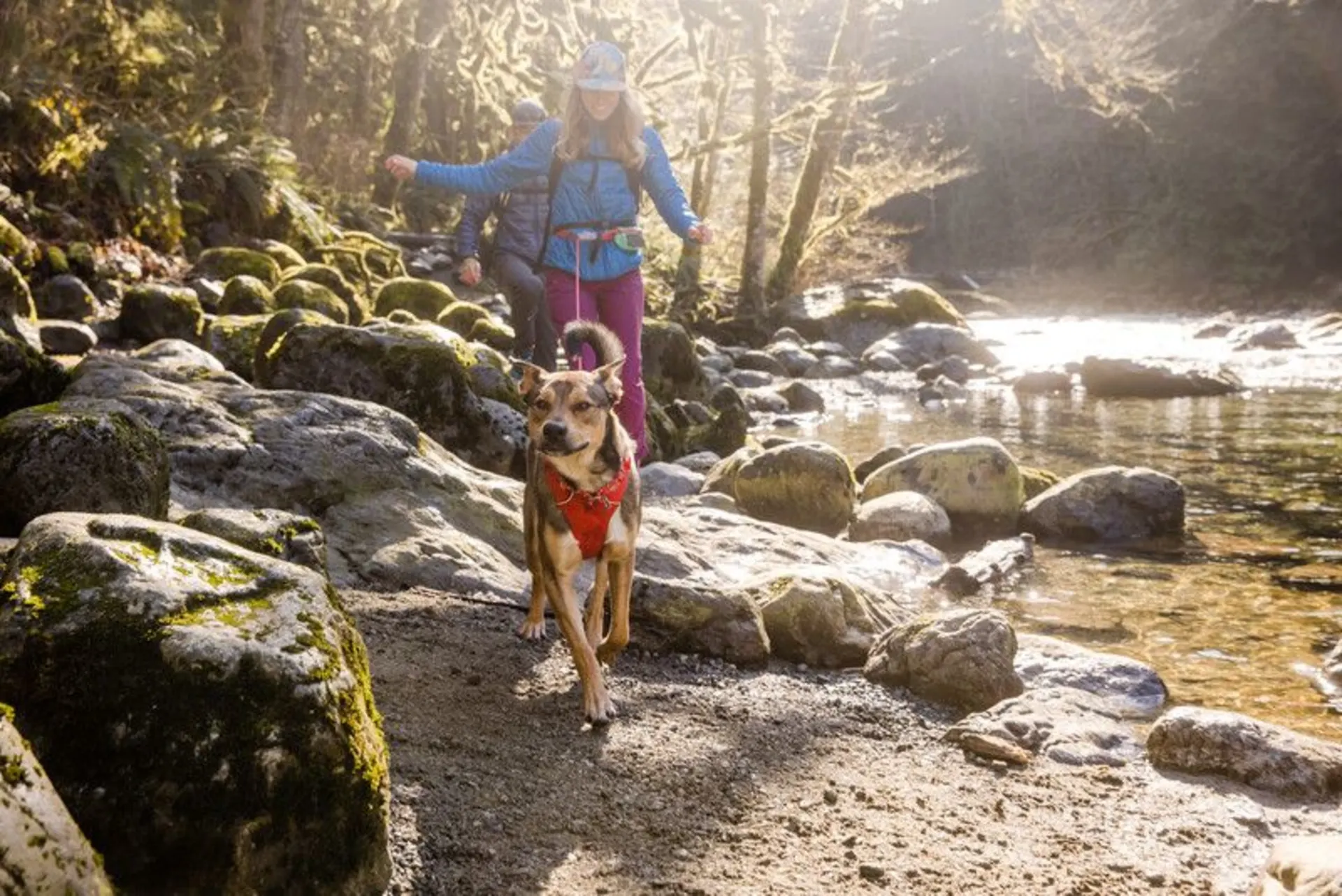 Gepolstertes Geschirr für die alltäglichen Abenteuer ist einfach anzulegen. Zwei Befestigungspunkte für die Leine: V-Ring auf dem Rücken des Hundes und verstärkte Gewebeschlaufe an der Brust für zusätzliche Kontrolle bei zweifachem Leinenanschluss.