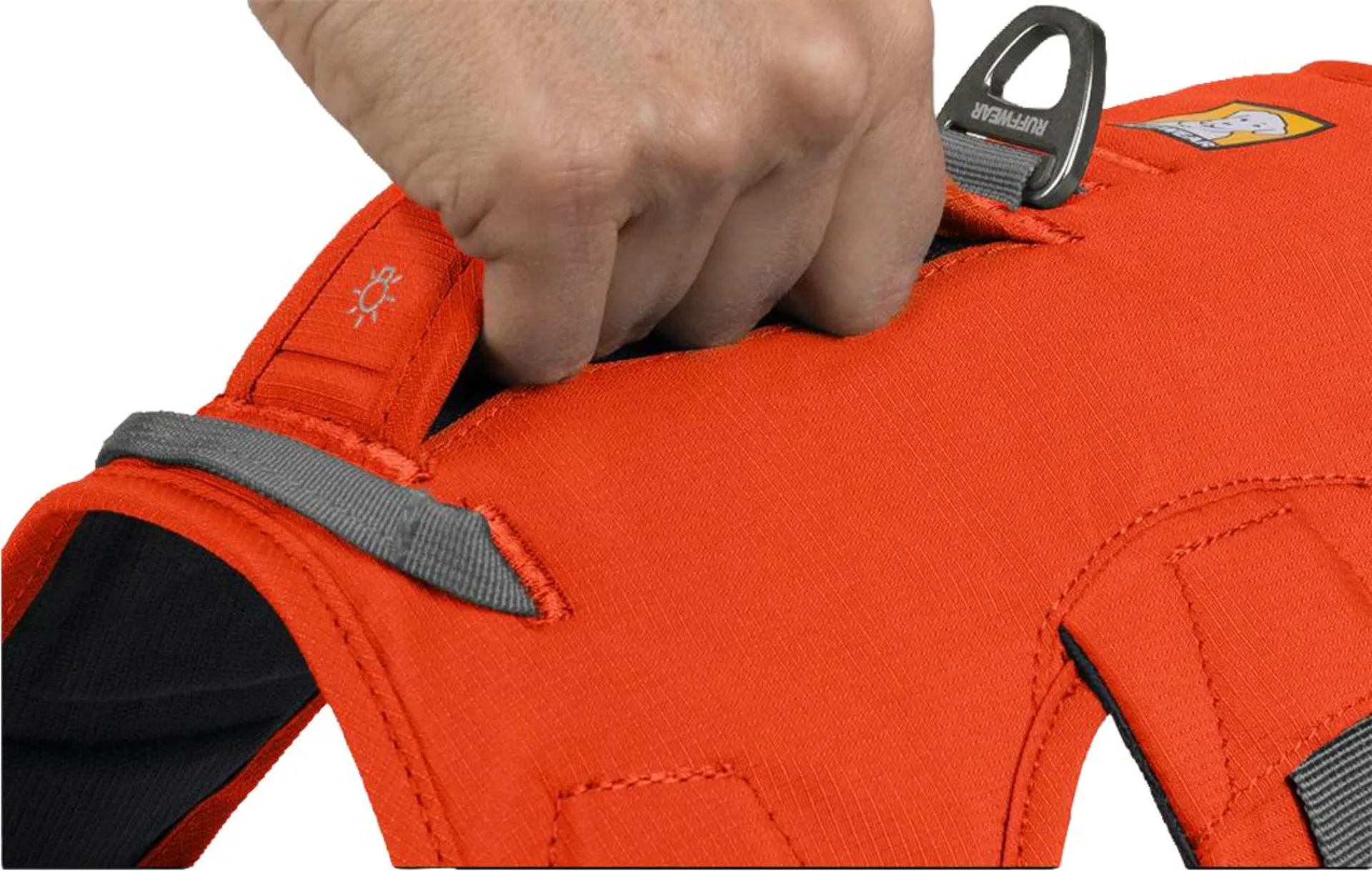 - Zwei Befestigungspunkte für die Leine: Aluminium-V-Ring und verstärkte Stoffschlaufe