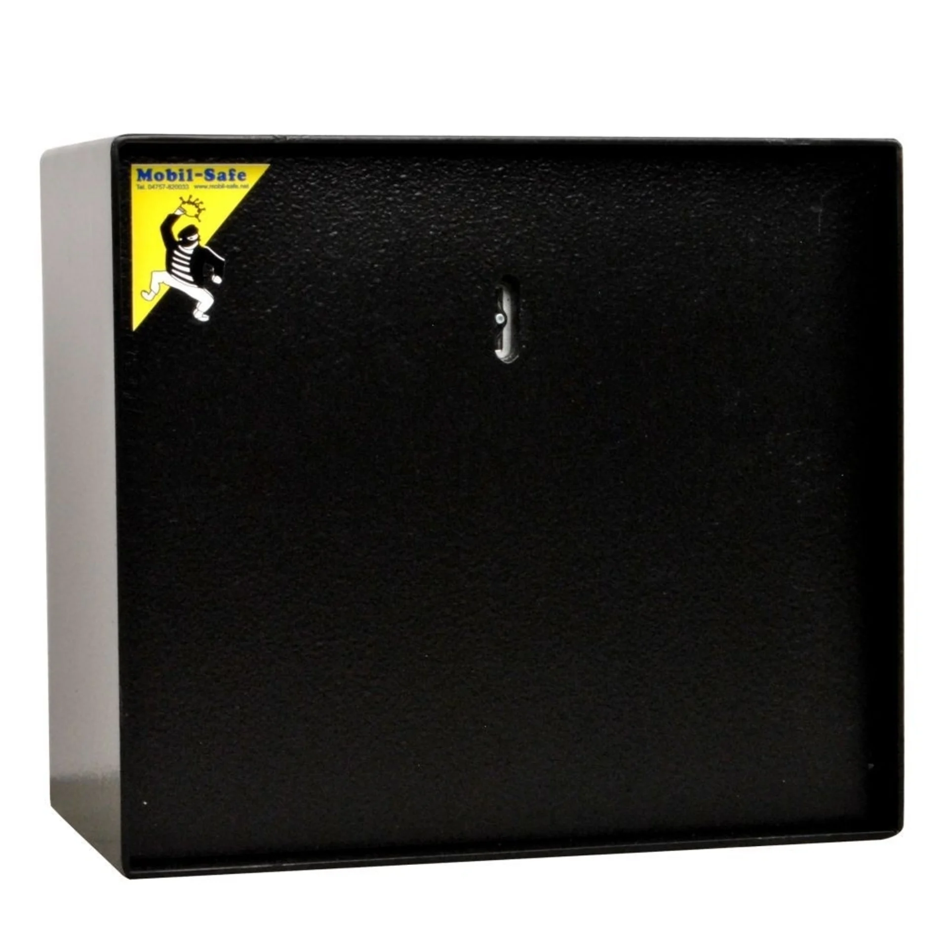 Der Mobil-Safe wird aus 3 mm Stahl gefertigt und ist mit einem schlag- und kratzfesten 2K Strukturlack lackiert. Die Tür ist aus 6 mm Stahl gefertigt und mit einem Doppelbar-Sicherheitsschloss versehen. Das Schloss ist ein deutsches Markenprodukt mit 7 Zuhaltungen. Eine mangangehärtete Schlossplatte verhindert ein Aufbohren. Durch die 3 cm innenliegende Tür ist der Mobil-Safe optimal gegen das Aufhebeln gesichert. Zusätzlich ist die Tür mit einem 15 mm Hintergriffwinkel auf der gesamten Breite gesichert. Befestigungsmaterial für den Einbau inklusive.