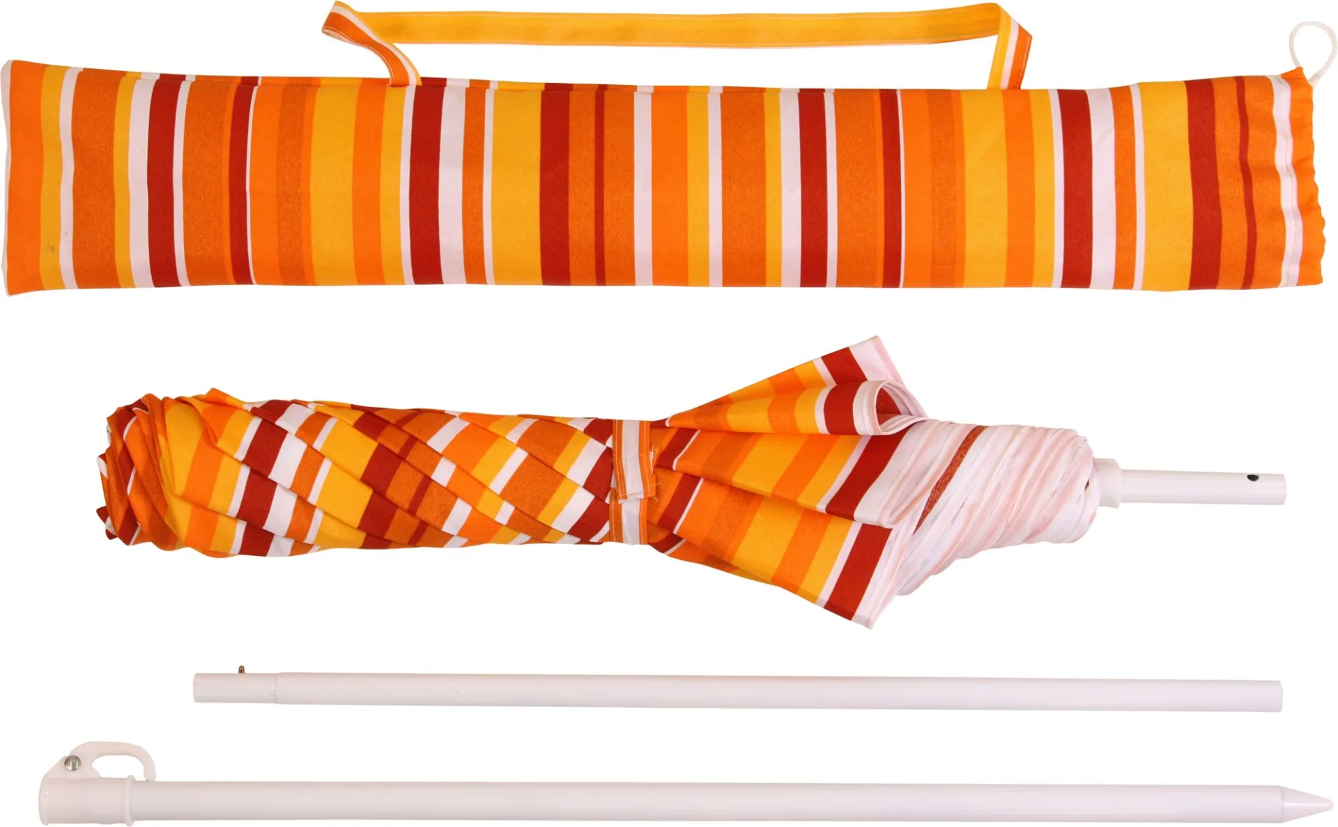 - Stahl-Gestell weiß pulverbeschichtet, Stock dreiteilig 19/22 mm Ø (Ober-/Unterstock), Falttechnik für kleines Transportmaß (ca. 65 cm).