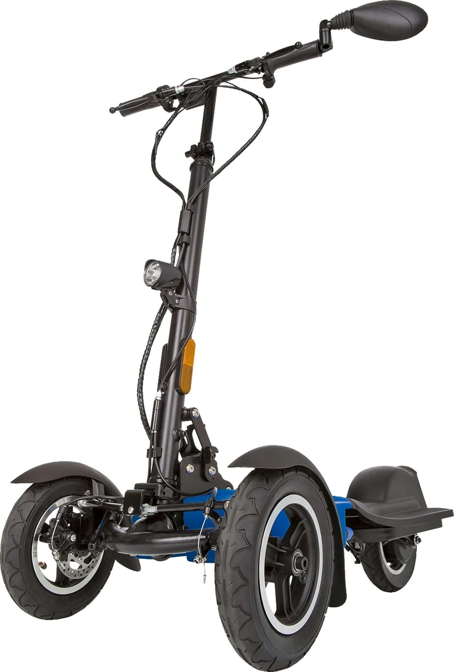 Er verfügt über ein dynamisches Carvingfahrwerk mit Kurventechnik sowie einen einzigartigen Faltmechanismus, sodass er bequem und platzsparend in Wohnwagen, Wohnmobil oder PKW verstaut werden kann. Das geringe Gewicht (23 kg inkl. Akku) garantiert Ihnen einen einfachen Transport. Der Roller wird komplett elektronisch angetrieben und bringt Sie dadurch zügig ans Ziel. Er erreicht dabei eine Höchstgeschwindigkeit von bis zu 20 km/h bei einer maximalen Reichweite von 30 km. Möglich macht das der integrierte Hochleistungs-Akku (Li-Ion, 37 Volt; 11Ah), welcher auch entnommen und seperat geladen werden kann. Ausgestattet mit einer Spitzenleistung von 500 Watt und einem im Lieferumfang enthaltenen Ladegerät.
