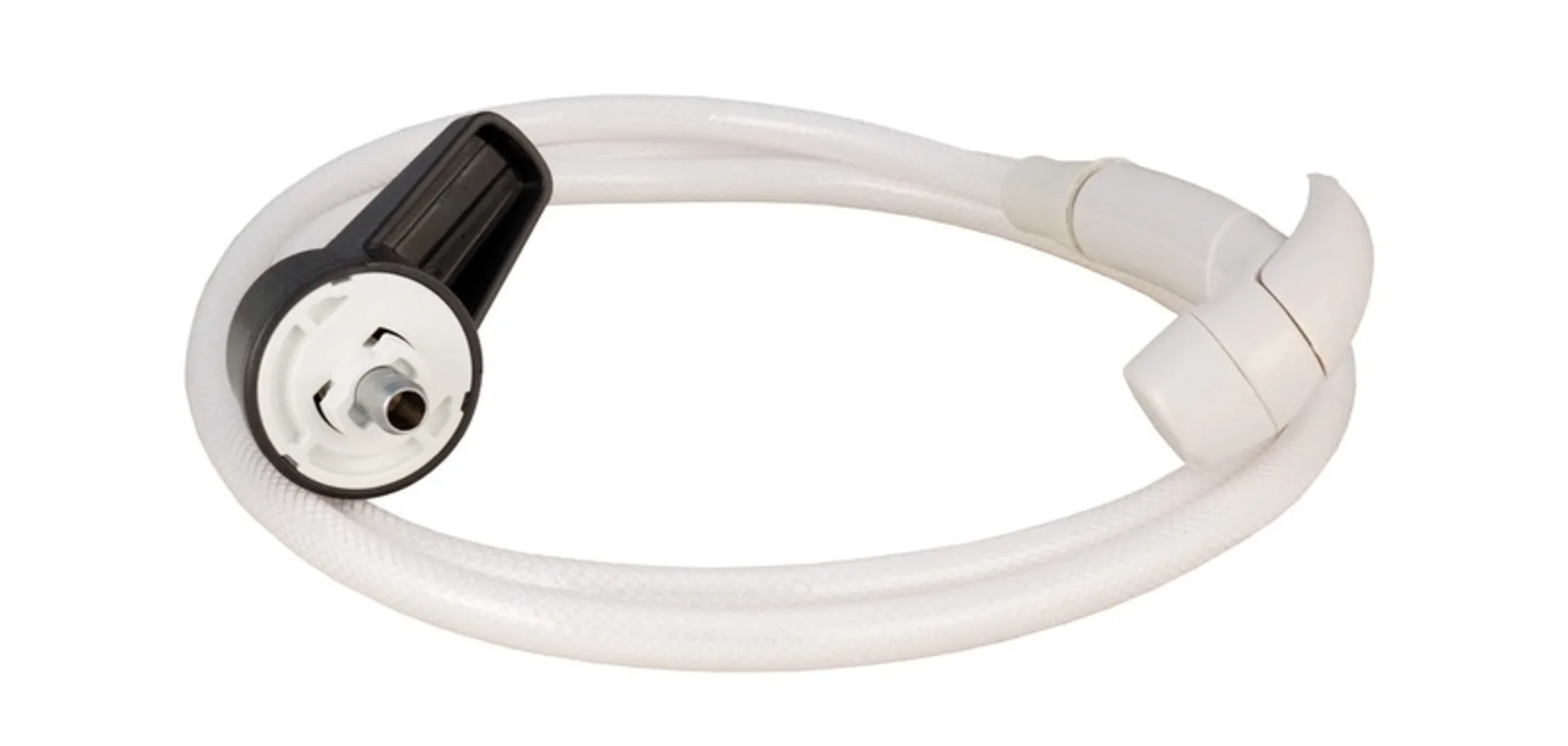 Temperatur durch Drehen des Anschluss-Stücks regelbar, abtrennbarer Duschschlauch (200 cm). Abdeckung rastet in offener und geschlossener Stellung ein.