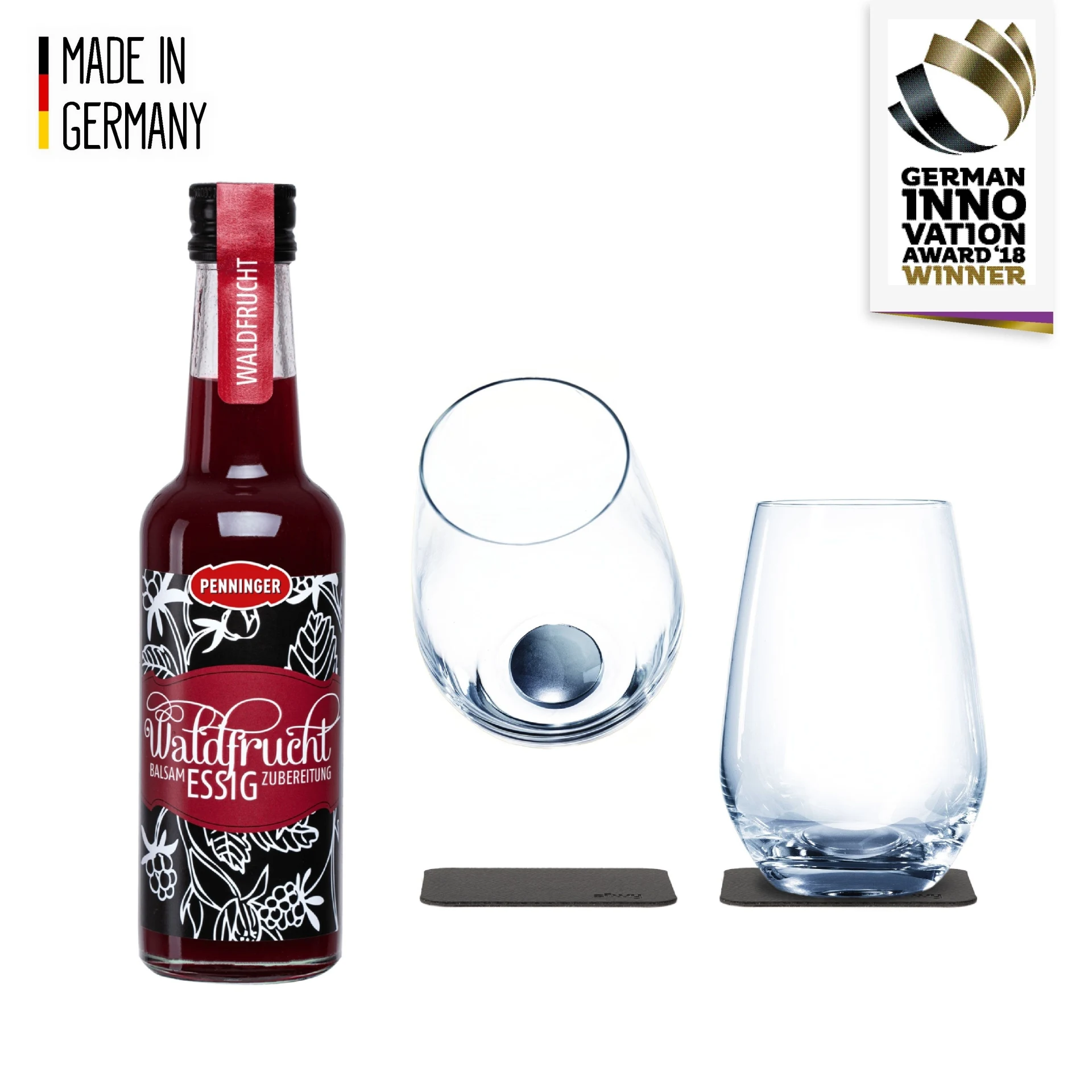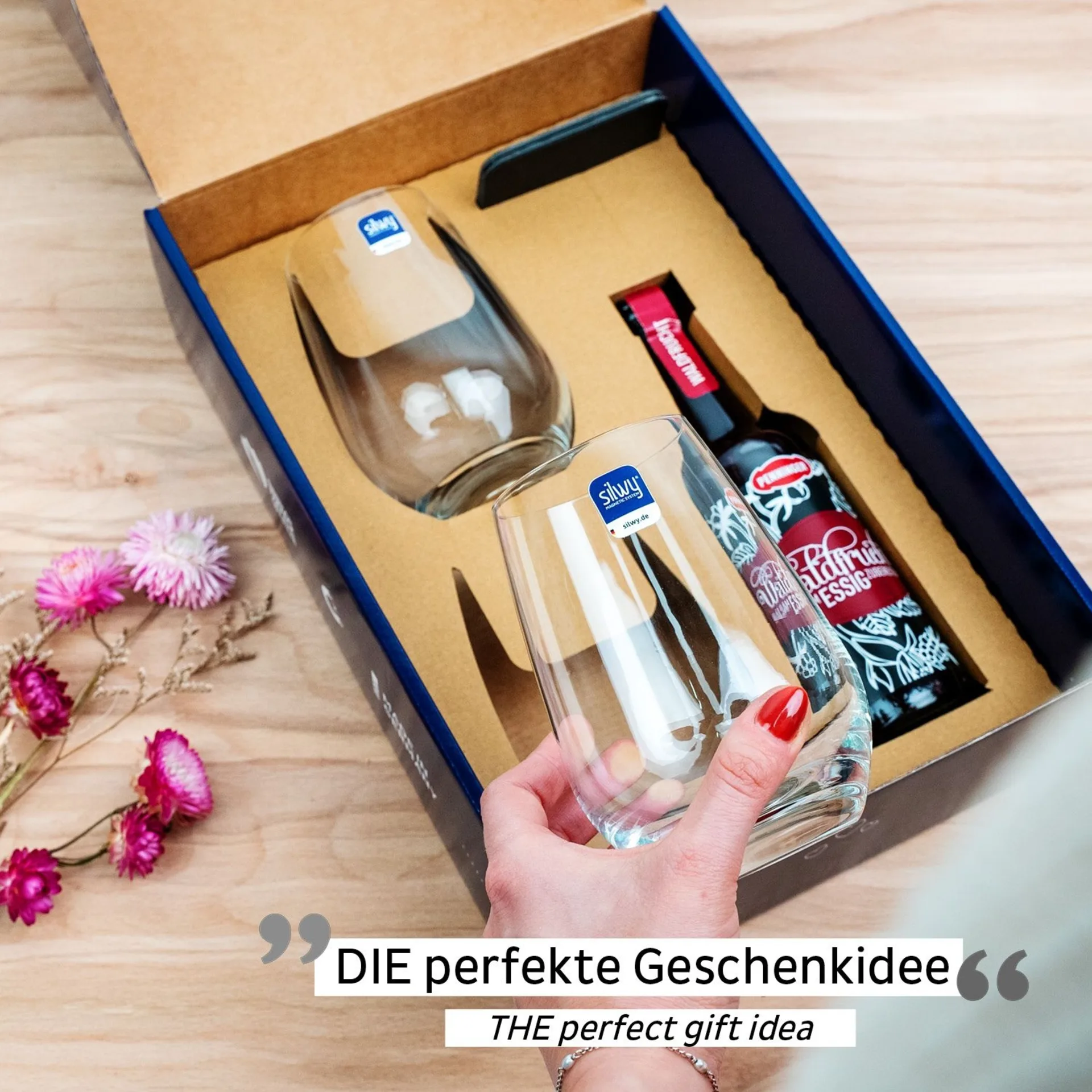 2 Magnet-Kristallgläser Longdrink, 1 Penninger Waldfrucht Balsamessig (0,25 l), 2 silwy NANO-METALL-PADS, 1 edle silwy Geschenkbox