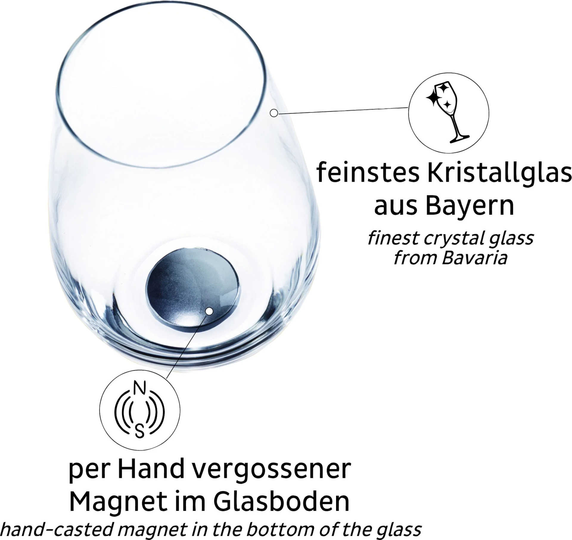 Diese eleganten Kristallgläser vereinen Stil und Funktionalität: Im Boden befindet sich ein handgegossener Magnet, der sie in Kombination mit den beiliegenden Metall-Nano-Gel-Pads sicher an Ort und Stelle hält – ideal für unterwegs. Die Pads sorgen für festen Halt und ermöglichen dennoch ein bequemes Abnehmen der Gläser. Dank smarter Nano-Gel-Technologie lassen sie sich rückstandslos entfernen, mit Wasser reinigen und beliebig oft wiederverwenden. So kannst du deine Gläser flexibel einsetzen – im Fahrzeug, beim Camping oder ordentlich im Schrank verstaut. Gefertigt aus hochwertigem Tritan, sind sie kratzfest, BPA-frei und selbstverständlich Made in Germany.