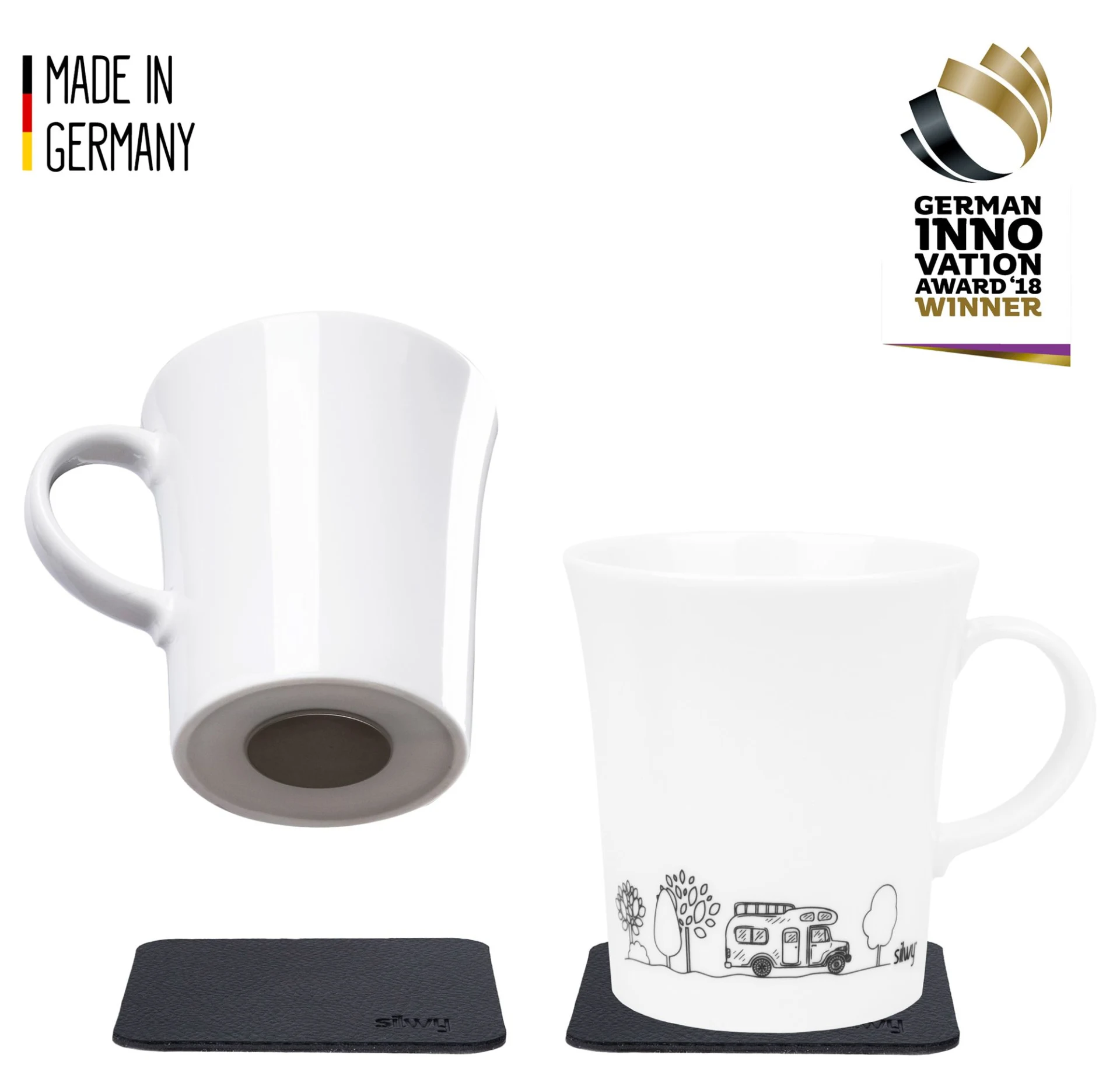 silwy® Porzellan Magnet-Henkel-Tassen CAMPING inkl. Metall-Nano-Gel-Pads BLACK