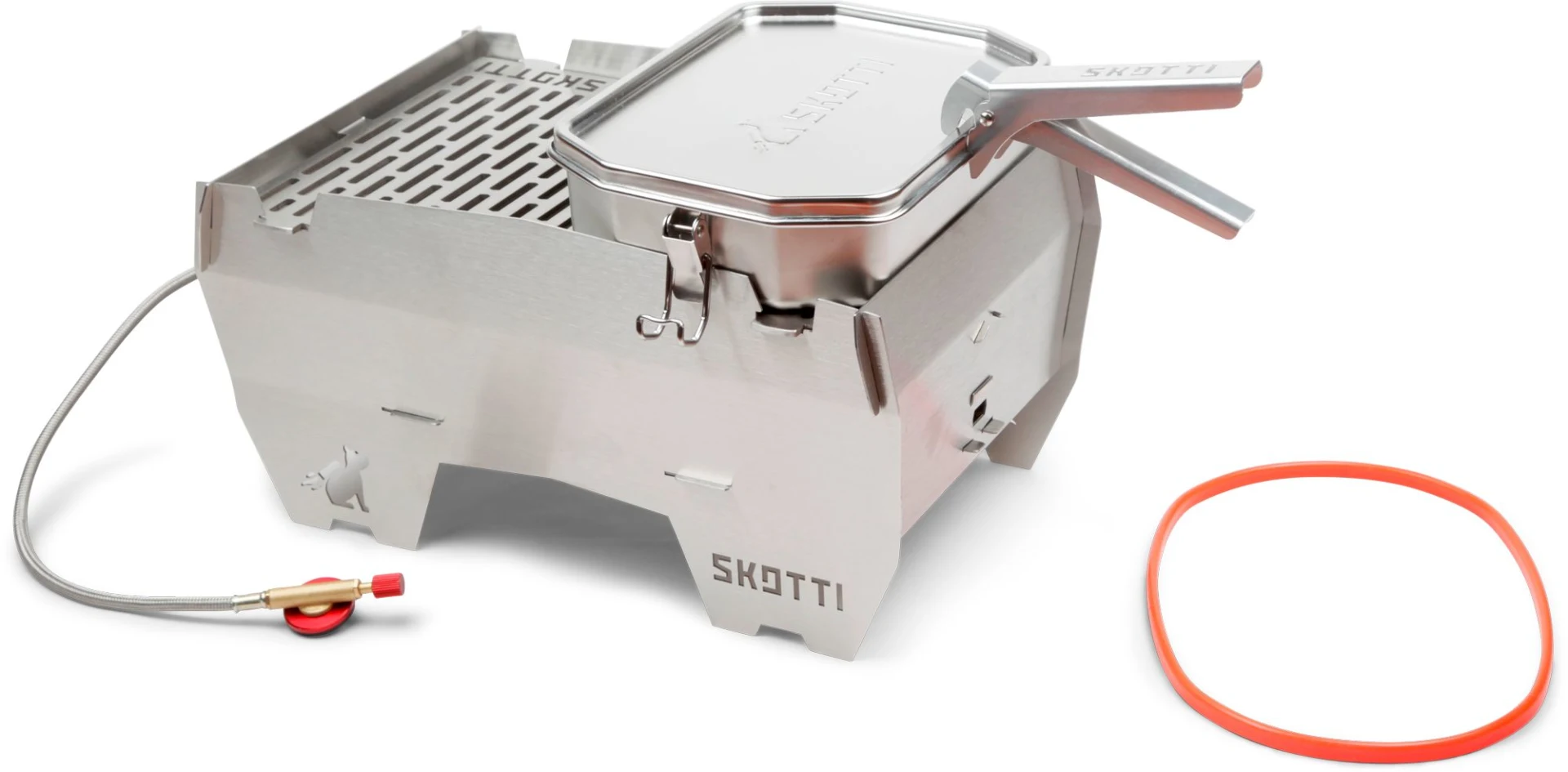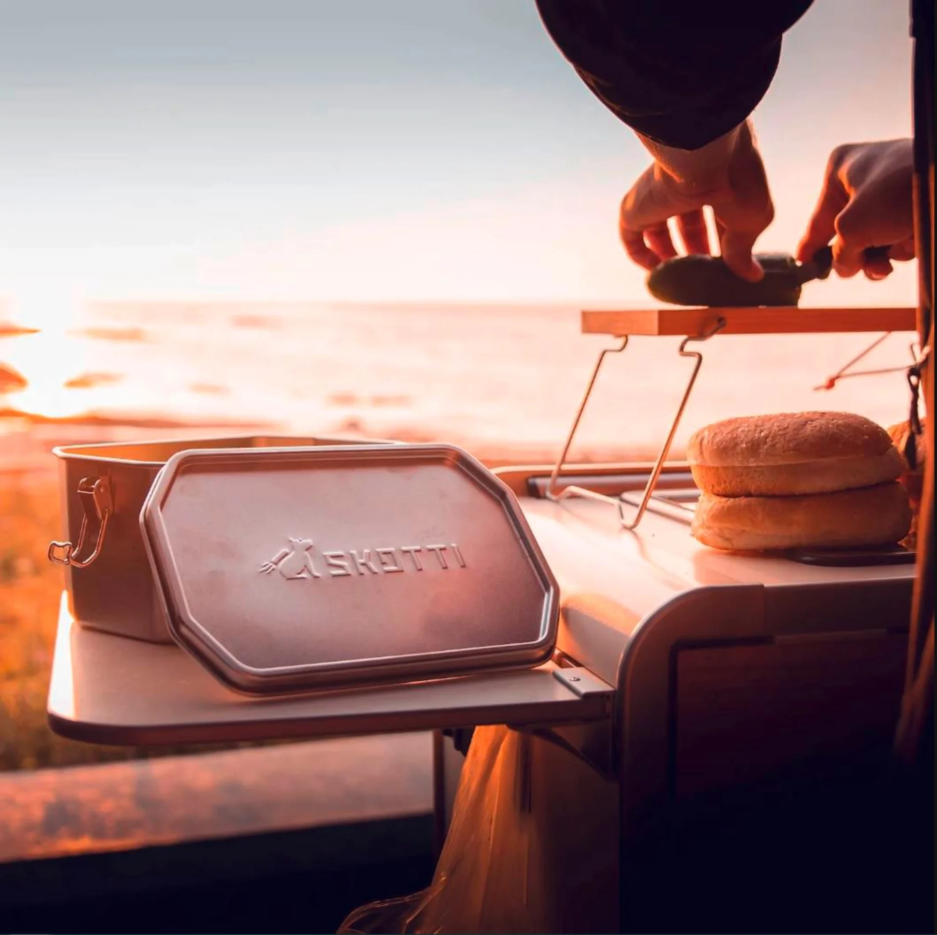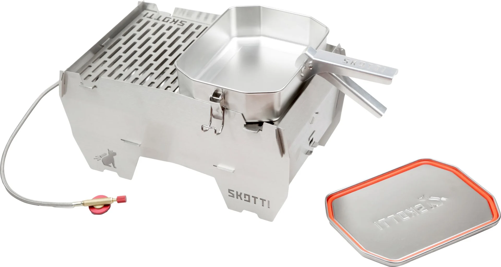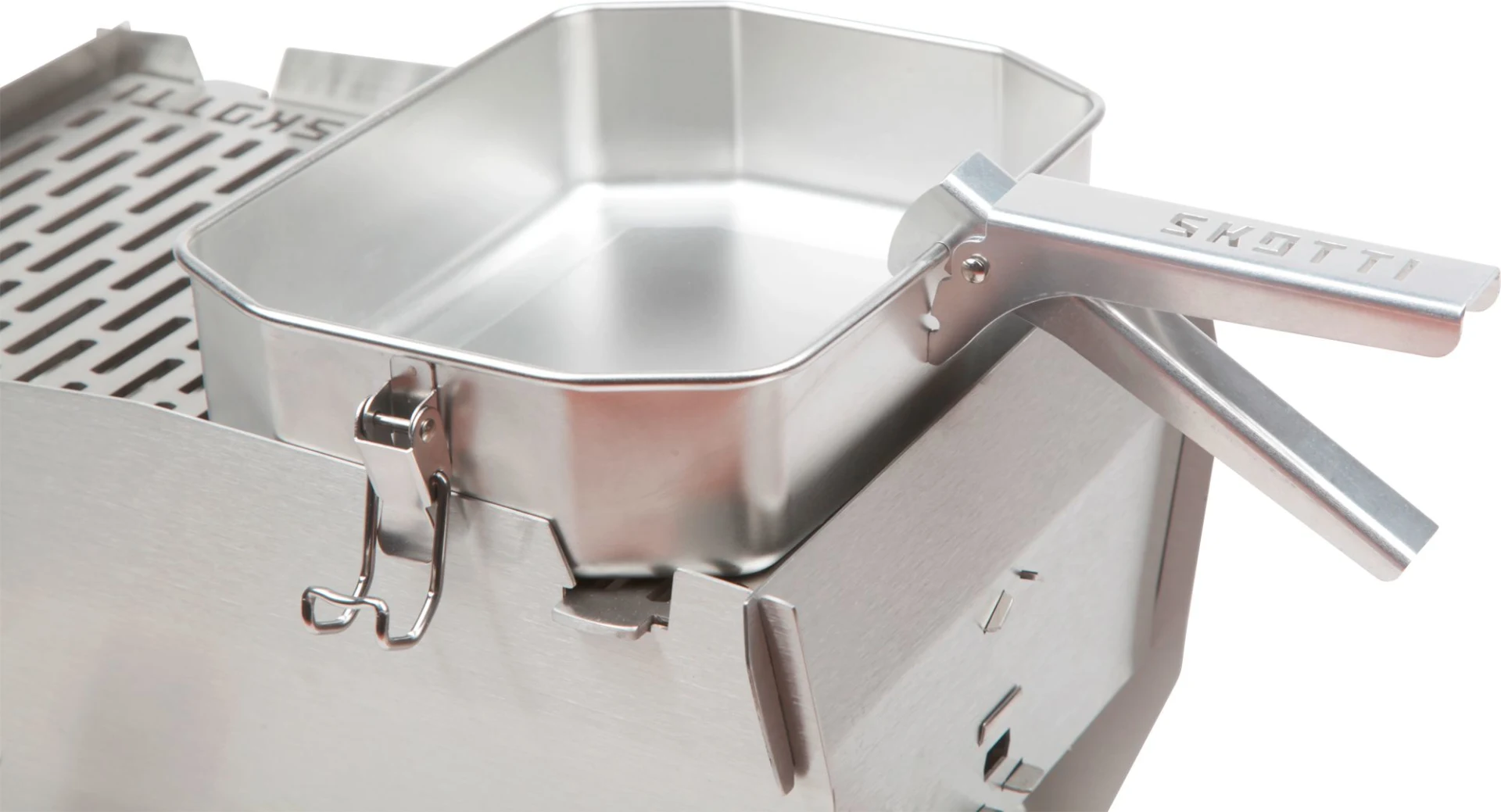 Transportieren, Kochen, Braten – mit der SKOTTI Boks aus Edelstahl wird aus Deinem SKOTTI Grill eine Outdoor-Küche to go! Jeder BOKS liegt eine stabile Griffzange aus Aluminium bei, mit der Du Deckel und Dose jeweils sicher heben und so als Topf oder Pfanne auf dem SKOTTI Grill benutzen kannst. Der Boden der BOKS braucht genau die Hälfte des SKOTTI Grillrosts – während Deine Nudeln kochen, die Currysauce blubbert oder die Zwiebeln schmoren, kannst Du also nebenan bequem weiter grillen.