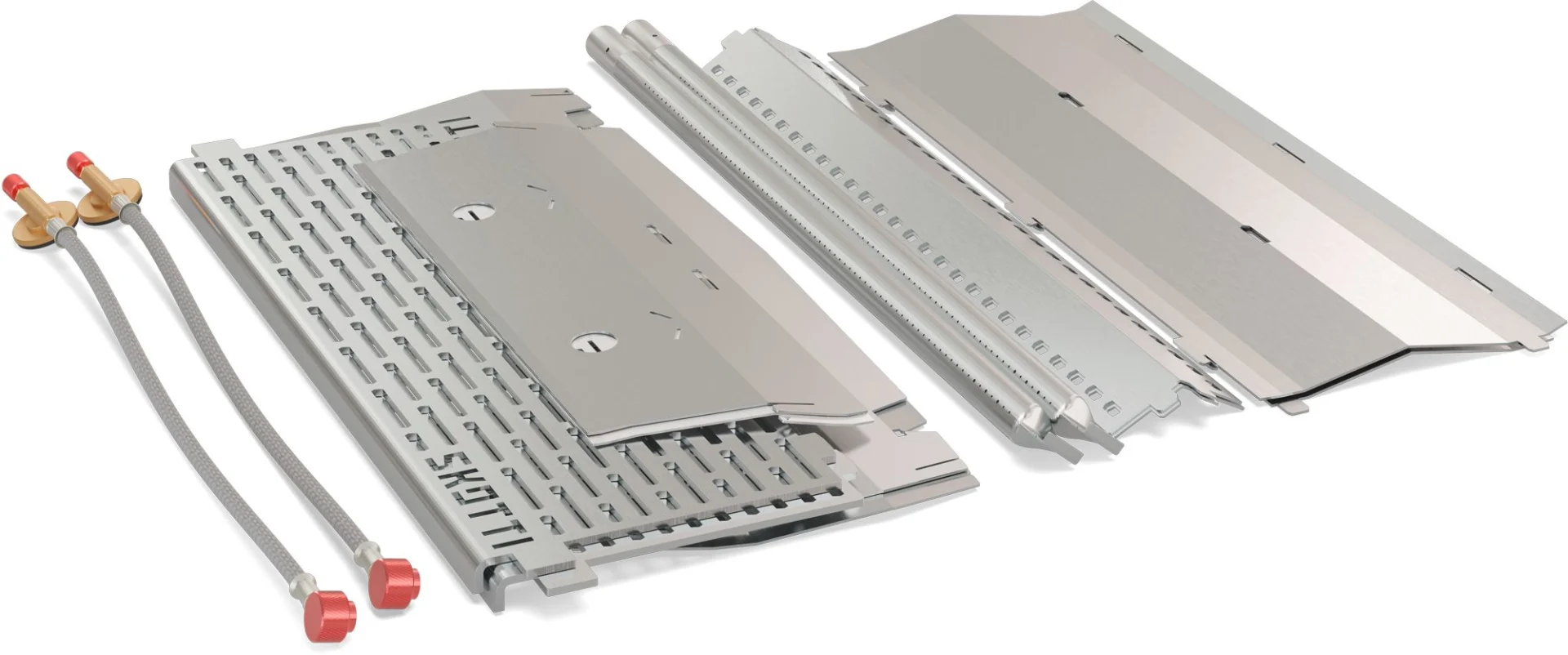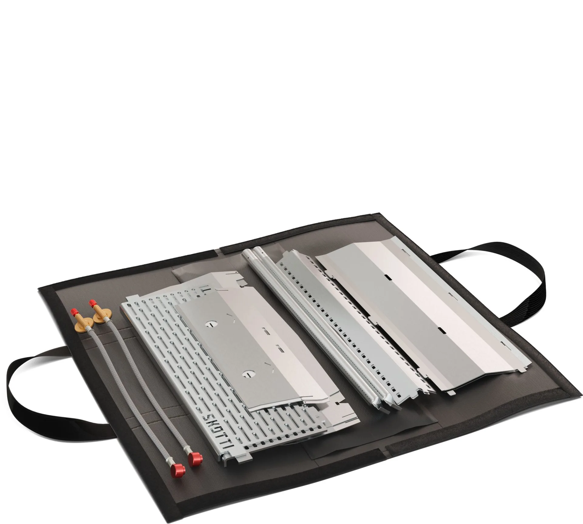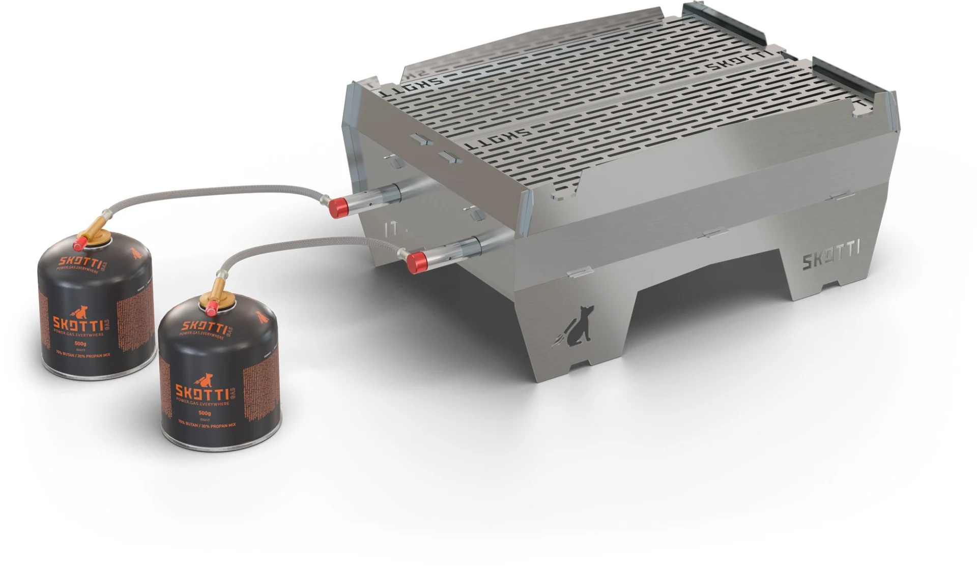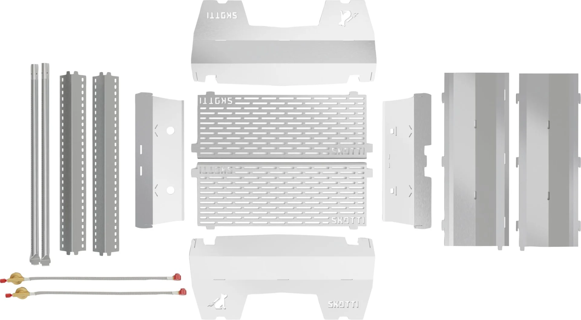 SKOTTI MAX besteht aus 14 Edelstahlteilen, die schnell und ohne Werkzeug zusammengesteckt werden. Über zwei parallele Brennerrohre wird die Grillfläche mit Hitze versorgt, die Gaszufuhr jeweils einzeln reguliert. Dadurch lassen sich auf dem Grillrost unterschiedliche Temperaturzonen herstellen, z.B. eine für besonders scharfes Anbraten und eine für langsames Garen bei niedriger Hitze.