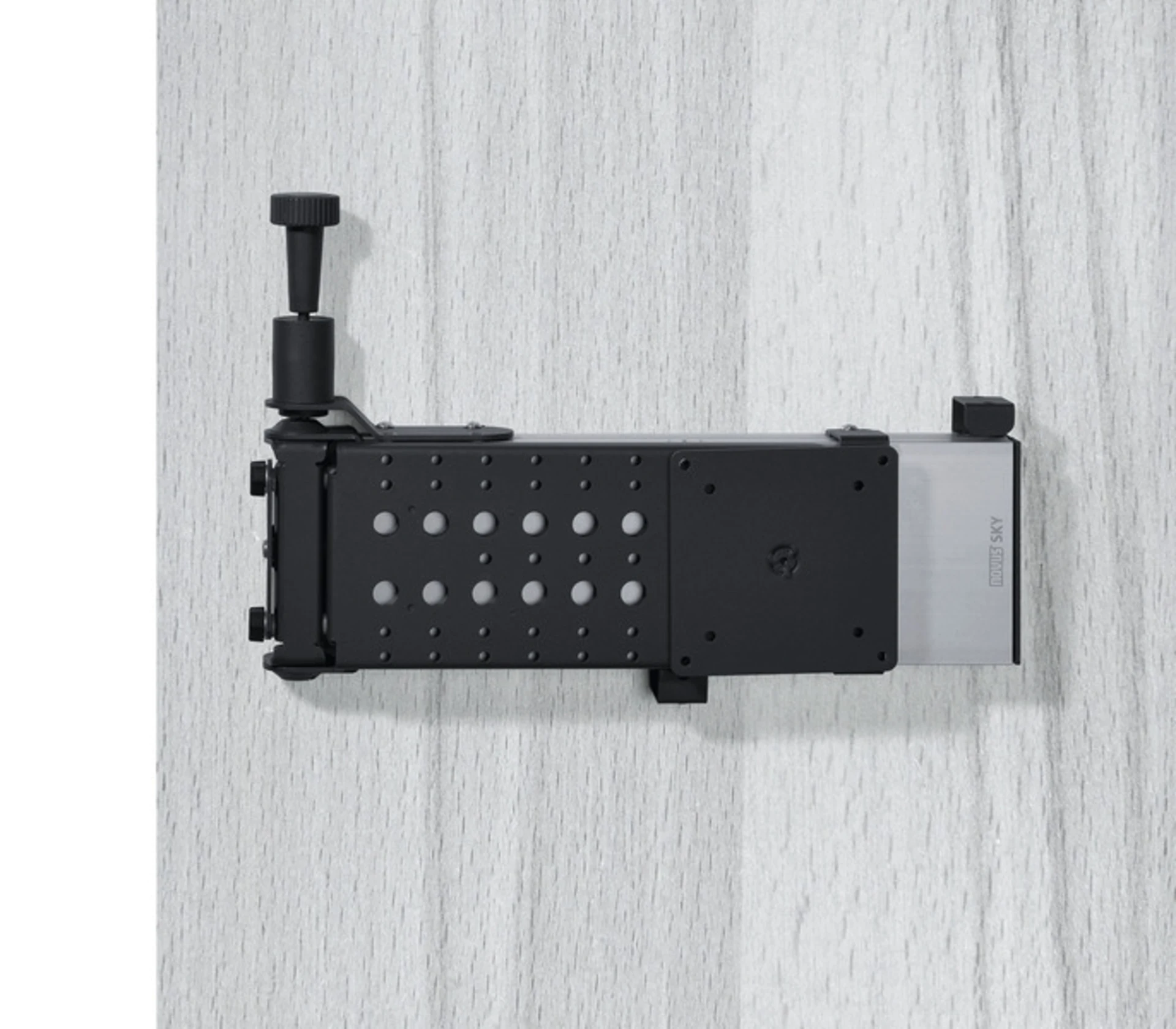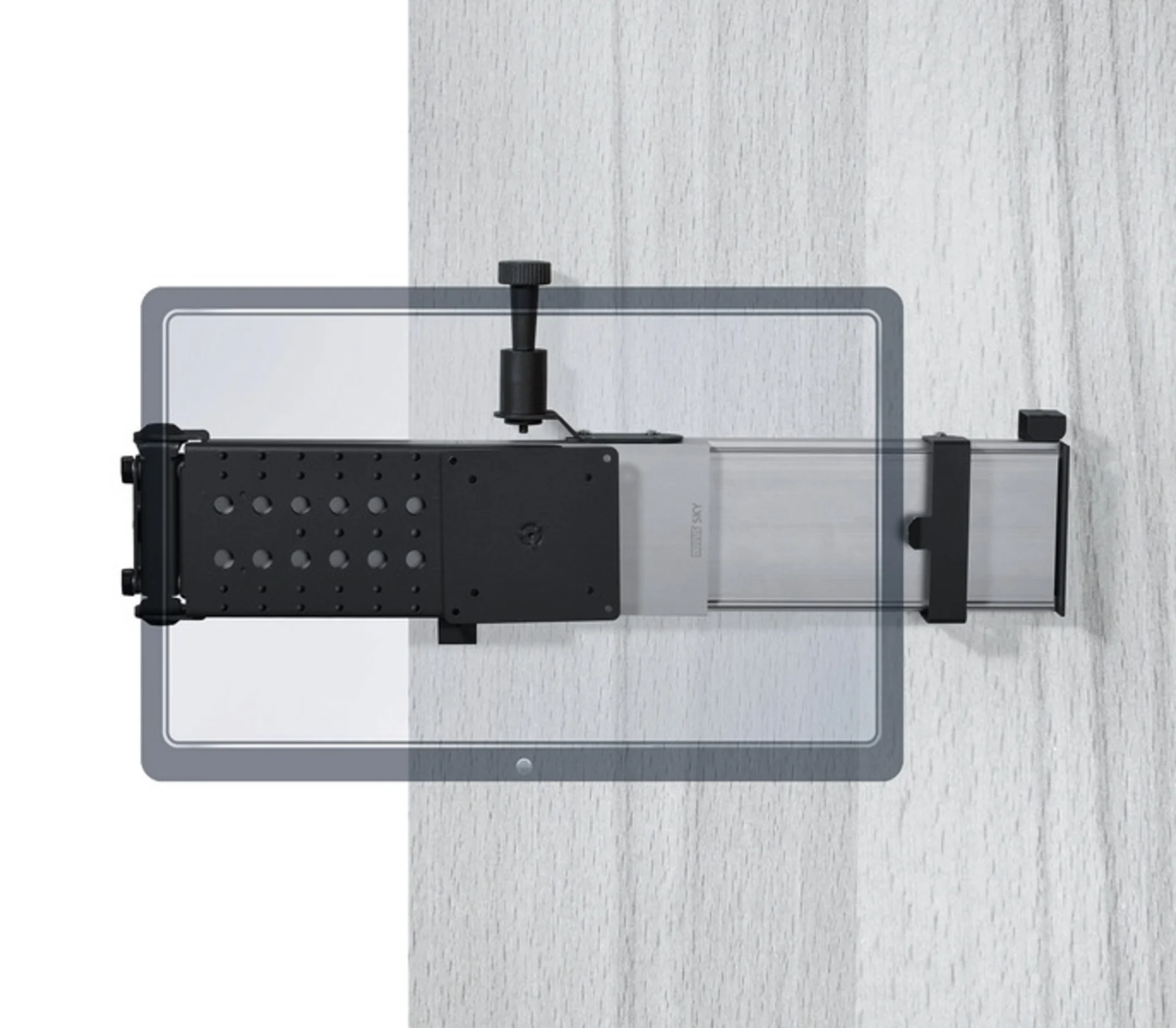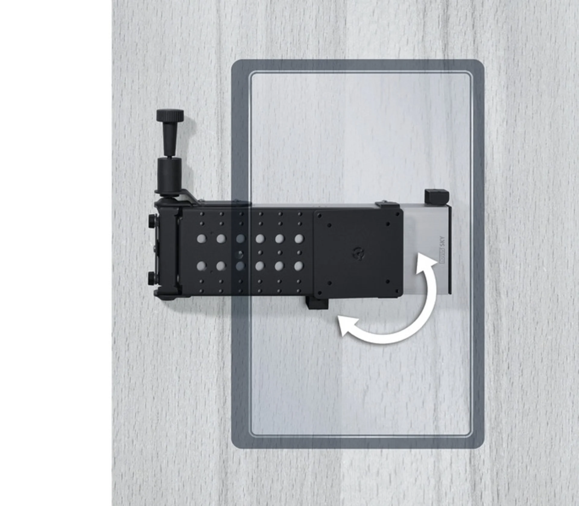 TFT-Wandhalterung SKY 20W (VESA 75+100). Auszug mit Arretierungshebel zur Sicherung des Bildschirms während der Fahrt. Inklusive Kabelführung. Bildschirm kann, je nach Einbausituation, optional um 90° gedreht werden, um eine geringere Einbautiefe zu erreichen. Bildschirm kann im ausgefahrenen Zustand um bis zu 180° geschwenkt werden.