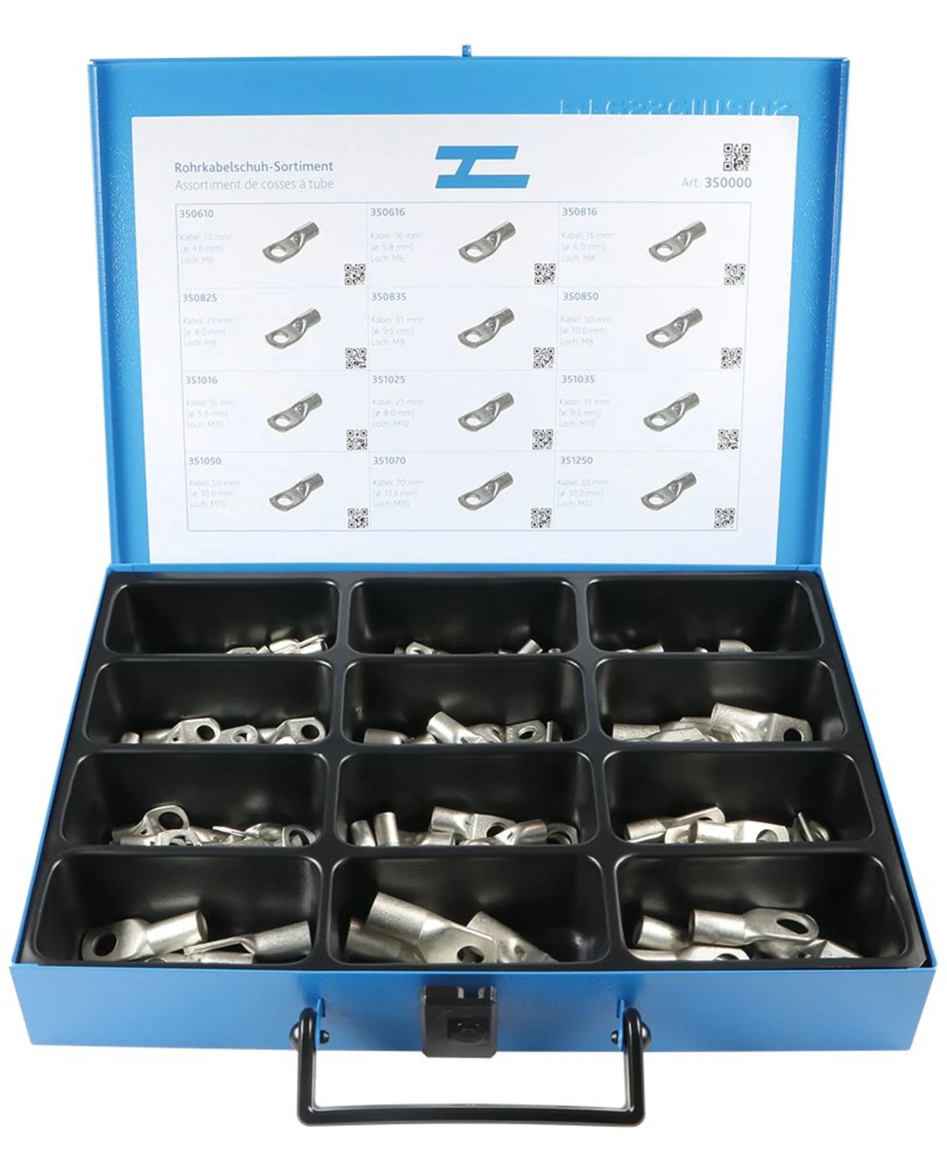 Sortiment Rohrkabelschuhe im Metallkoffer mit 12 Fächern.