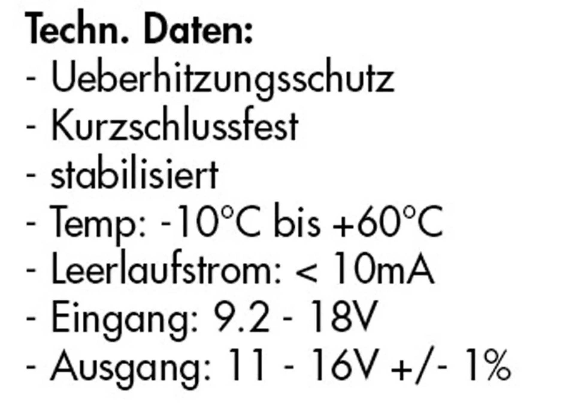 Eingangsspannung9.2 - 18 VAusgangsspannung11-16 V einstellbarLeistung4.2 AAbmessungen159 x 97 x 37.5 mm