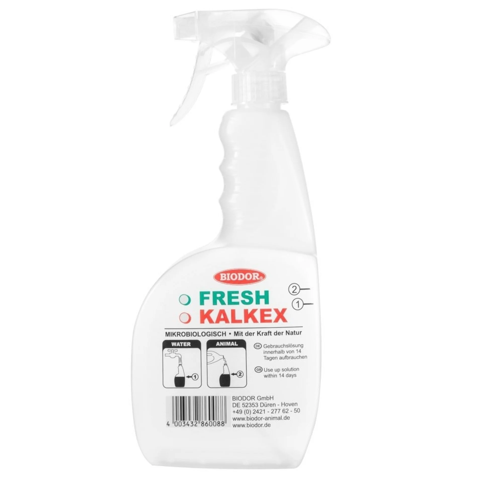 Leere Sprühflasche für Biodor Befüllung mit praktischer Dosiermarkierung.