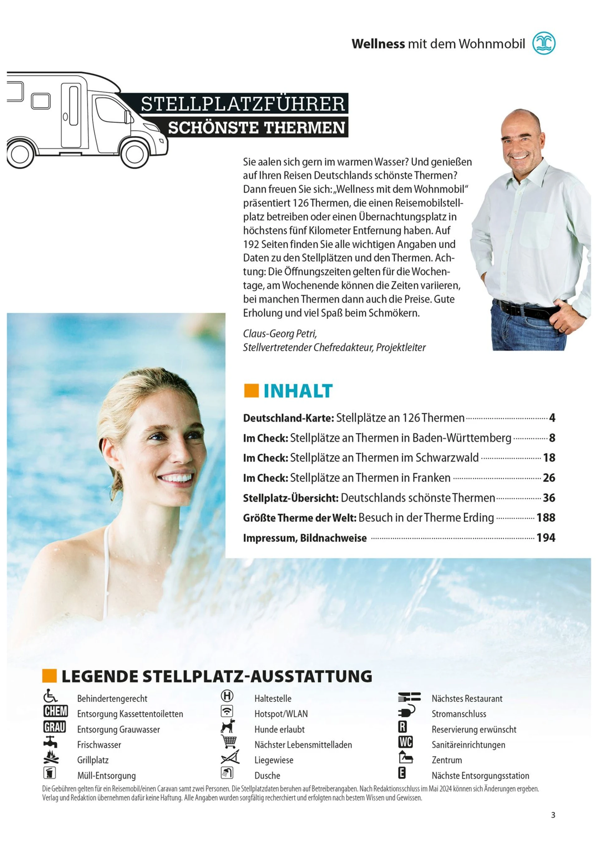 - PLUS: spezielle redaktionelle Checks von Thermen mit dort nahegelegenen Stell- und Campingplätzen beispielsweise im Schwarzwald oder in Franken