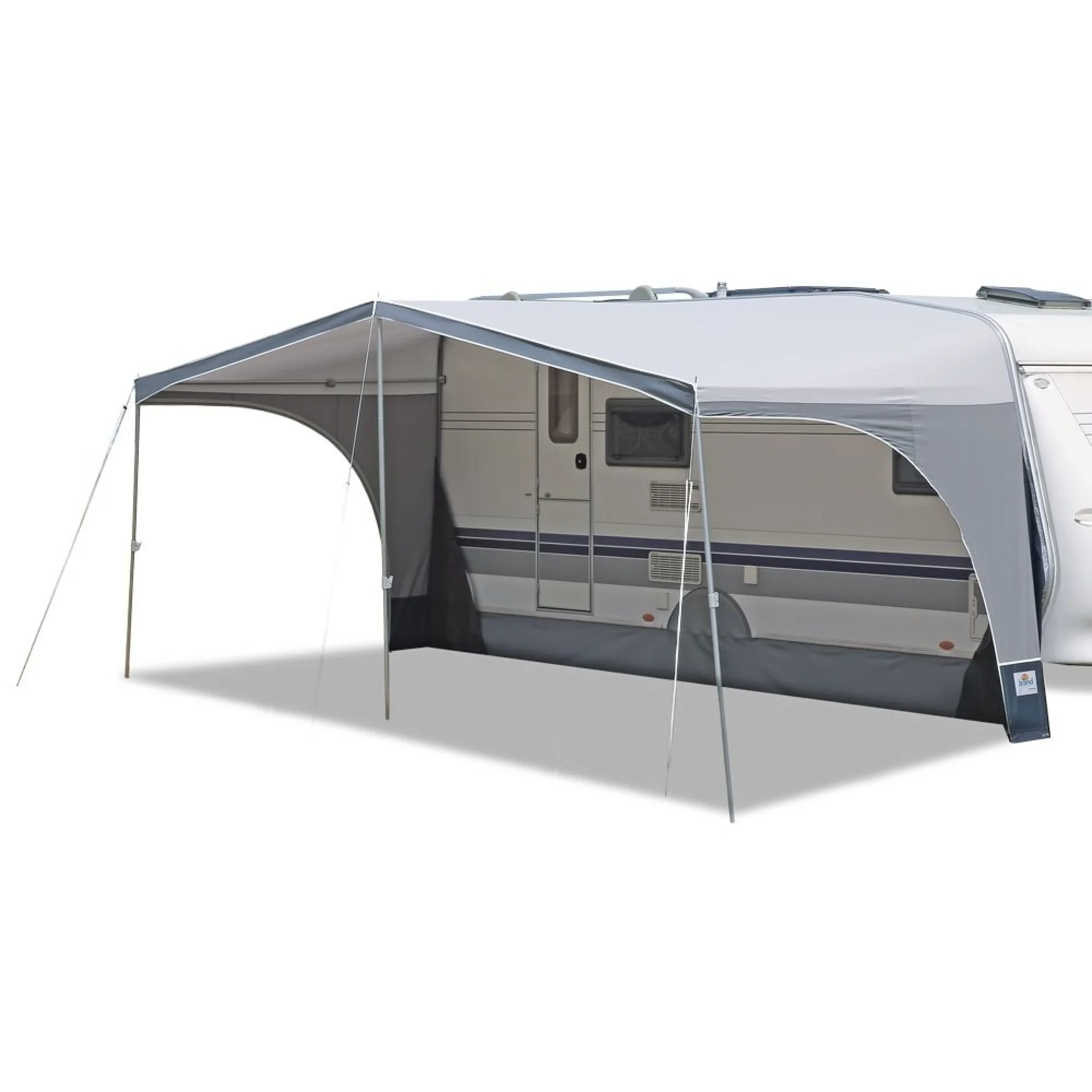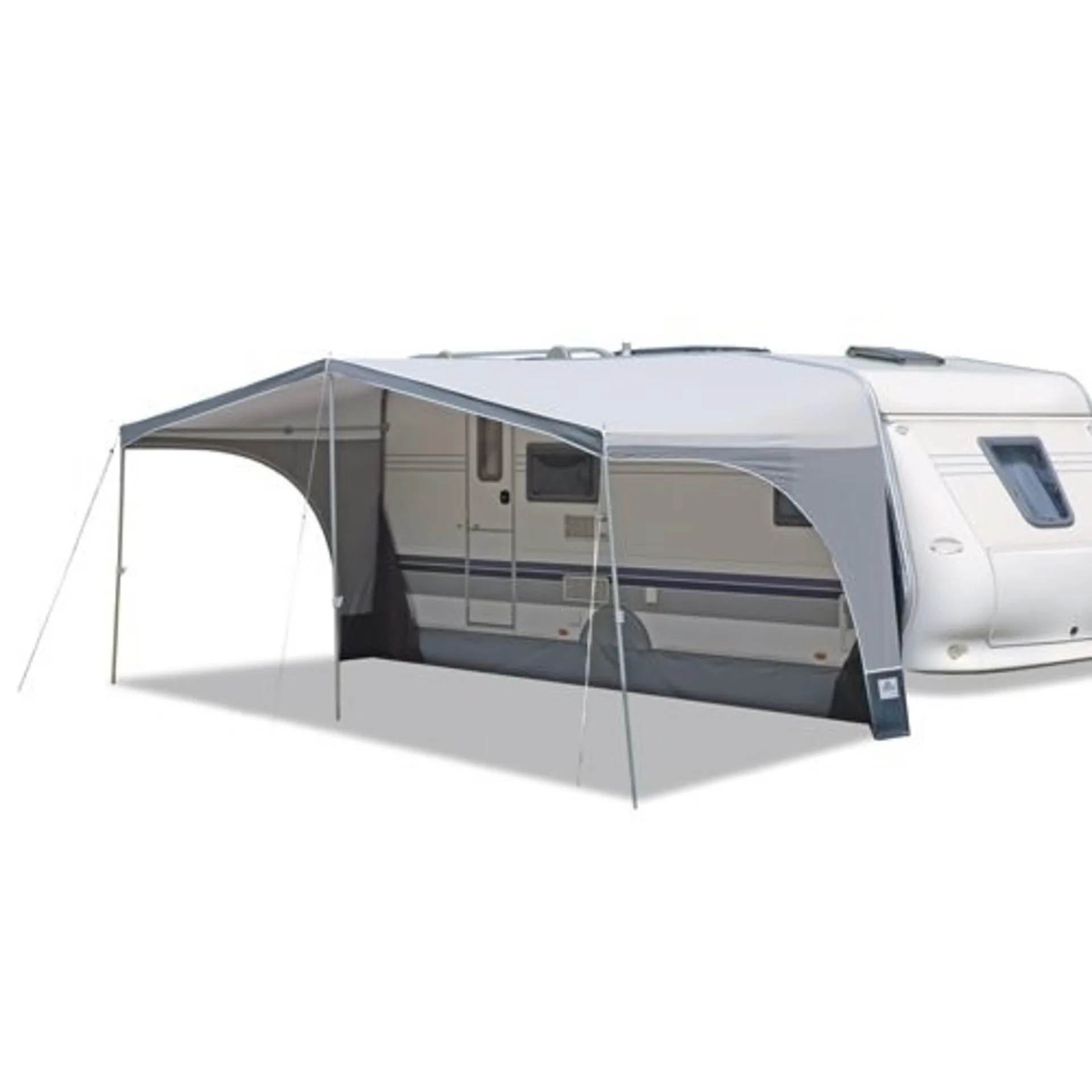 Das Brand - Qualitäts-Sonnendach, inklusive Seiten-blenden. Serienmässige Lieferung mit einem 28 mm Aluminium-Vorzeltgerüst (in allen Grössen mit 3 Dach-und 3 Aufstellstangen, zusätzlich ausgestattet mit dem PorwerGrip-System. Dieses Reise-Gestänge in Kombination mit dem TC-Touring-Gewebe garantiert ein minimales Gewicht. Abspannung der Seitenblenden mit unserem funktionalen Multifunktionsstreifen.