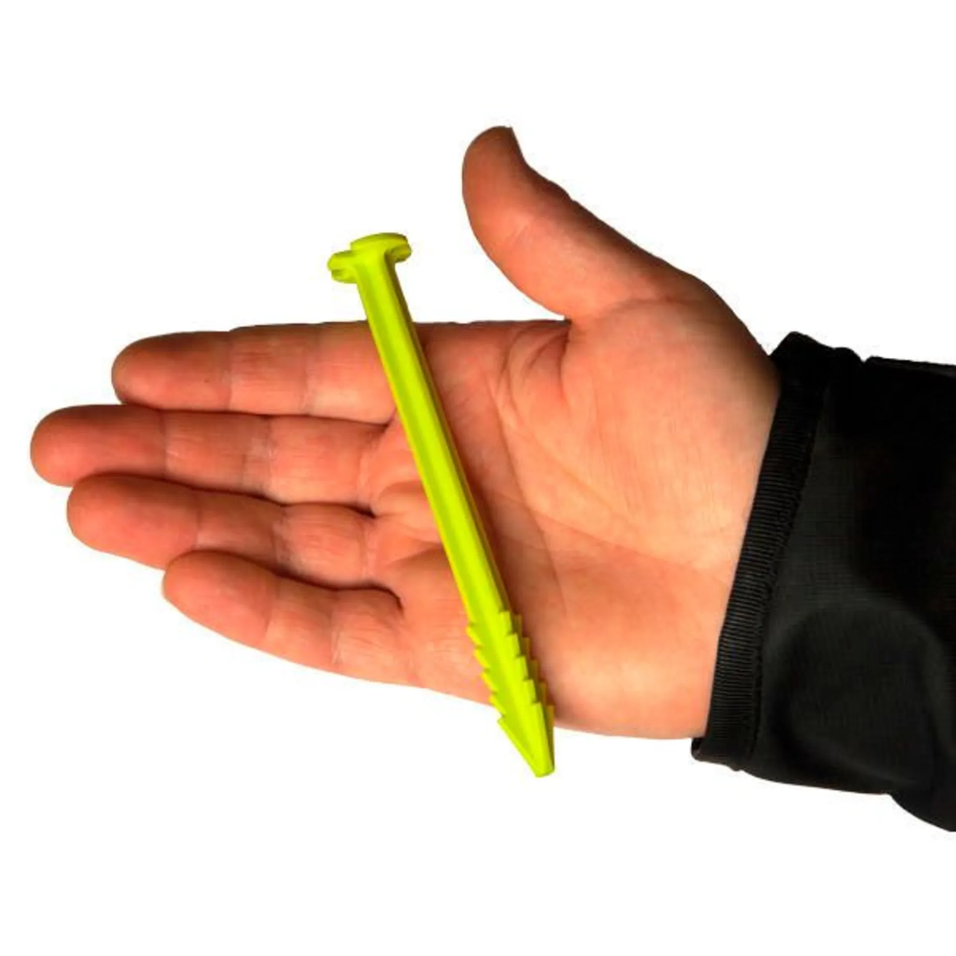 Innovativ und in der Schweiz hergestellt, bieten sie gegenüber herkömmlichen Heringen aus Metall deutliche Vorteile: Sie sind ultraleicht und aufgrund ihres flachen Profils besonders fußfreundlich. Ihre spitz zulaufende Form ermöglicht ein einfaches Einschlagen, während ein x-förmiger Querschnitt mit Sägezahnprofil für sicheren Halt in unterschiedlichsten Böden sorgt. Der flache Kopf komprimiert den Untergrund und maximiert die Haltekraft. Einkerbungen halten die Zeltleinen zuverlässig am Platz und sorgen für beste Verankerung.
