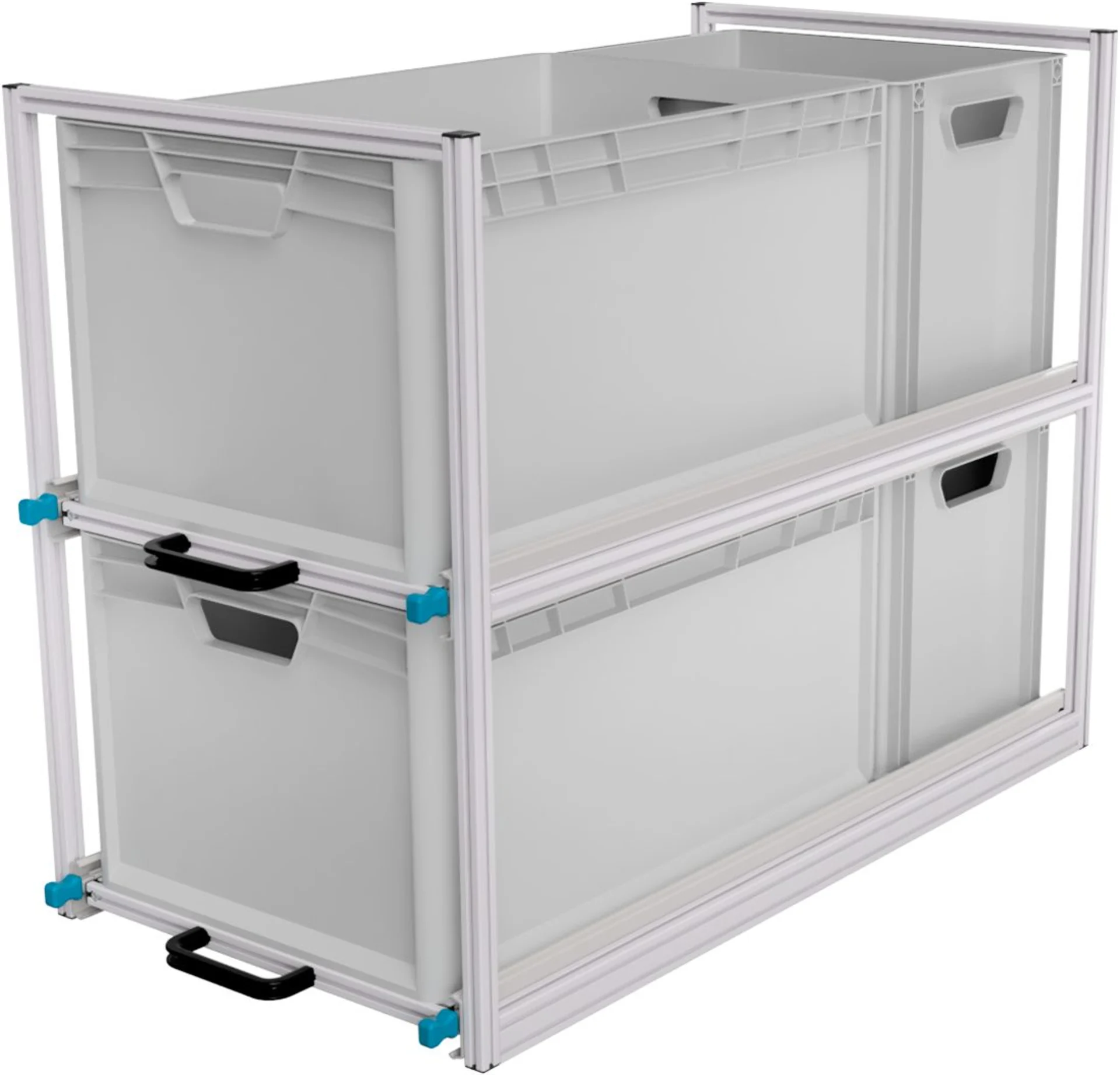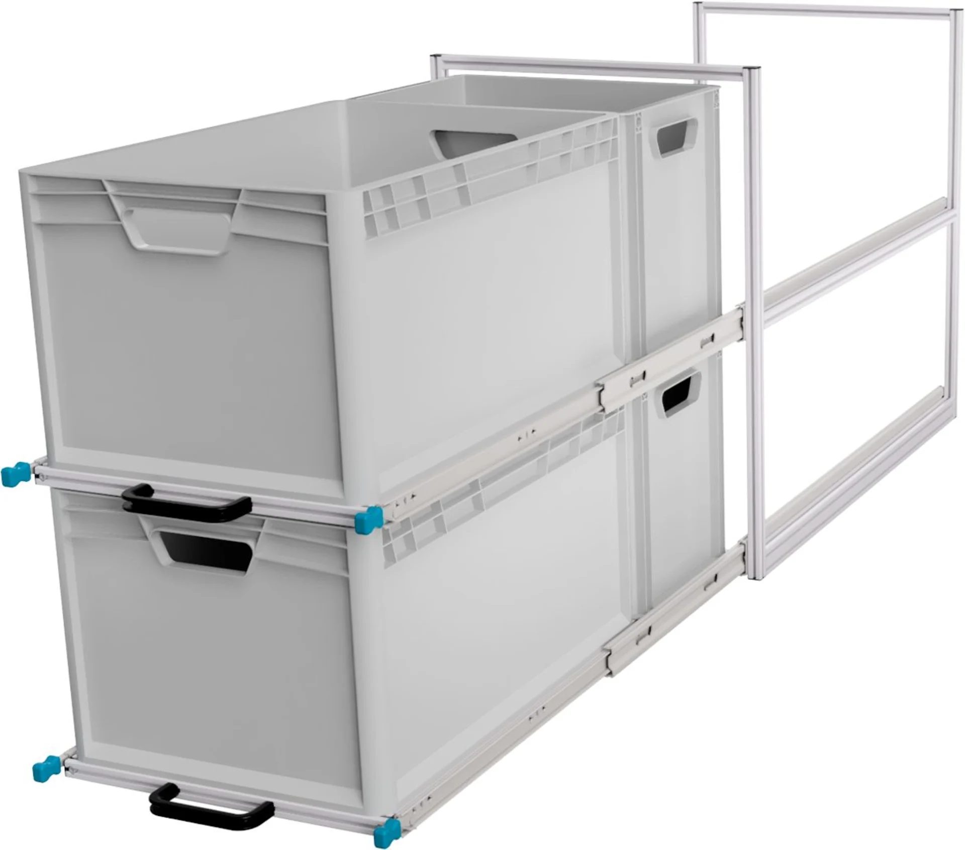 Das Regal-System für den Kastenwagen mit 2 Etagen für EuroBoxen der Grundfläche 60 x 40 cm sorgt für Ordnung und Sicherheit im Laderaum.