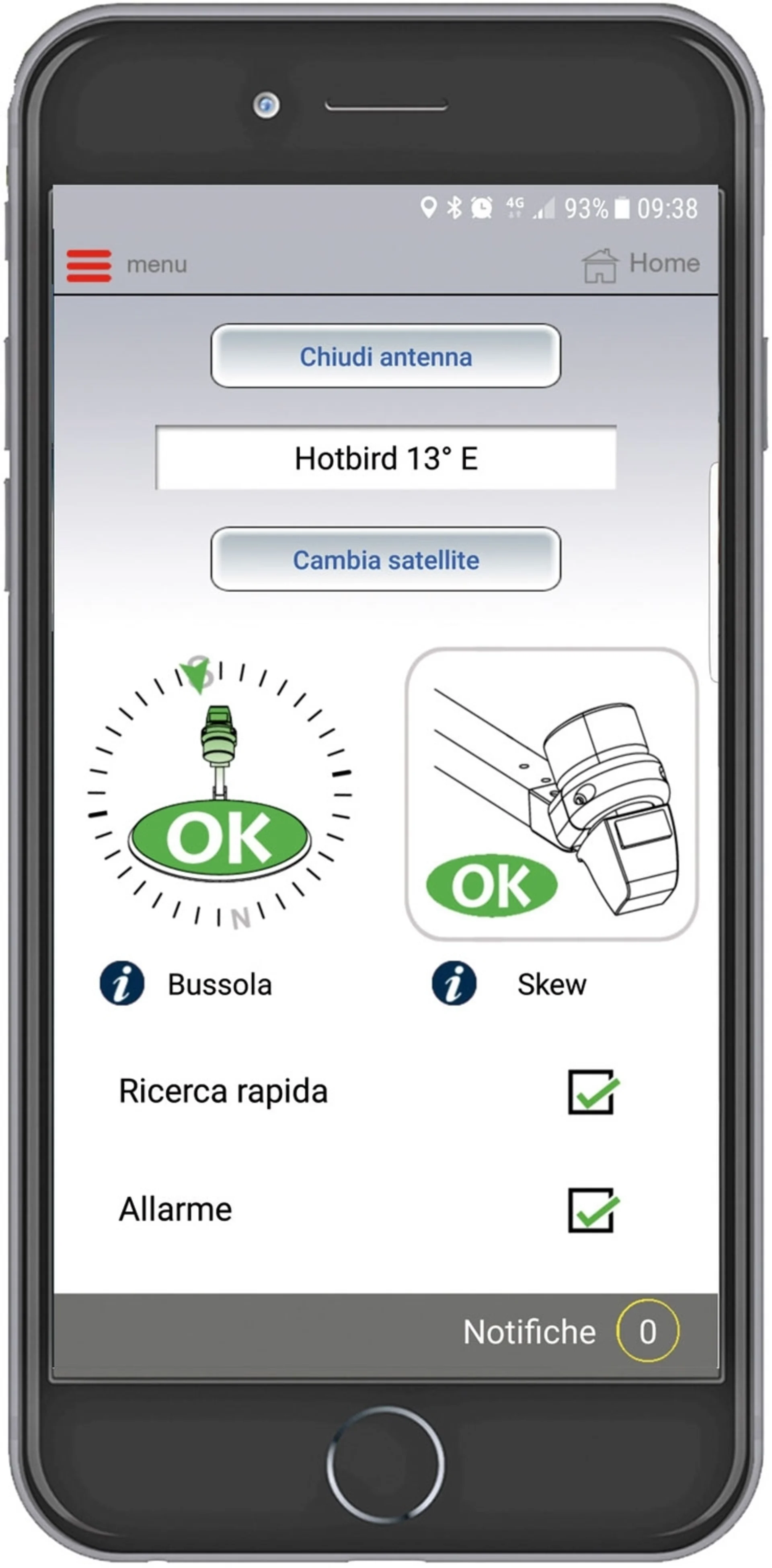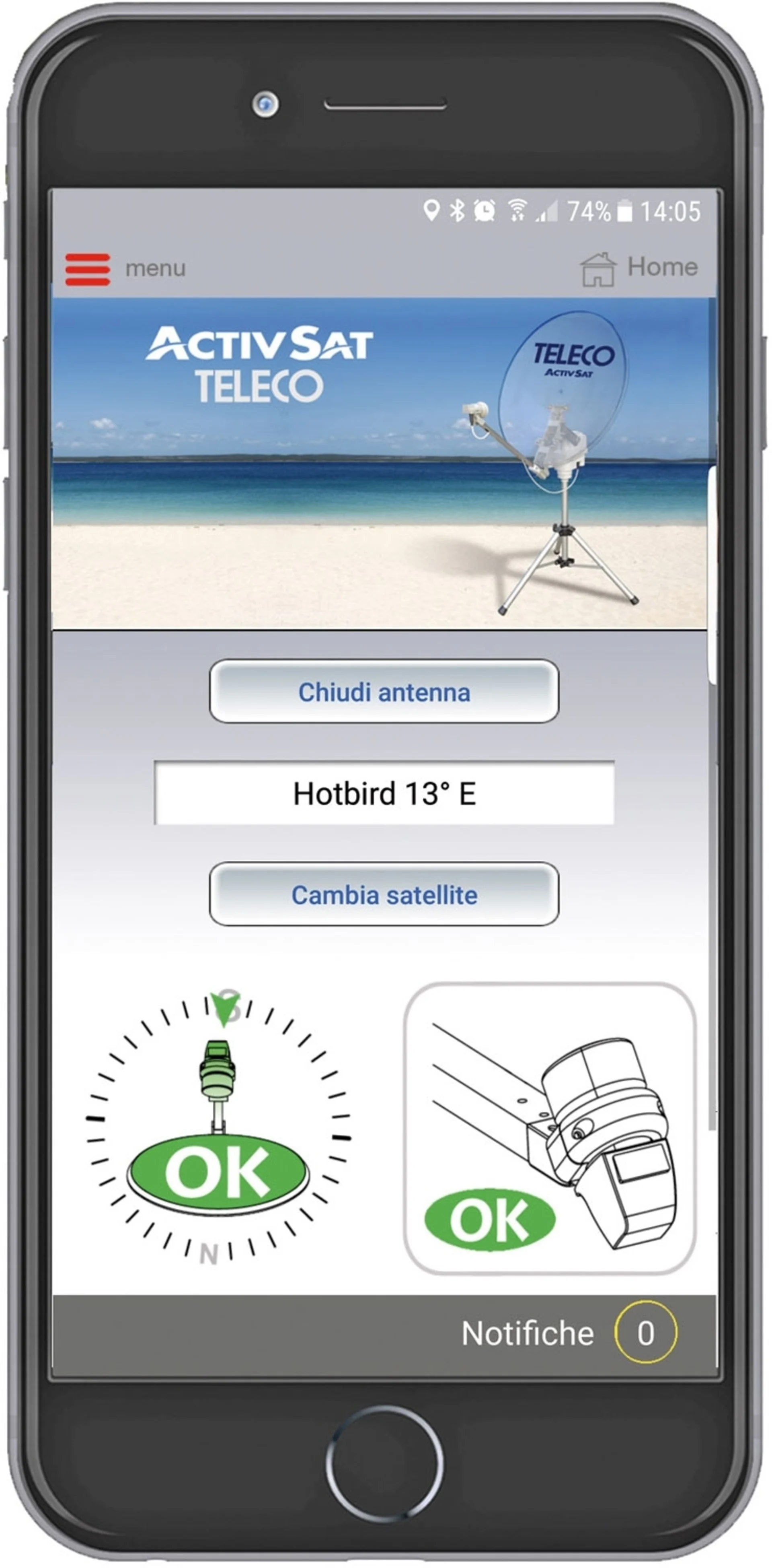 Öffnen Sie einfach nur das Stativ, fixieren Sie die Motoreinheit darauf, schieben Sie die Parabolschüssel ein und schließen Sie das Kabel (15 m) an die externe Activsat-Steckdose des Fahrzeugs an. Die Montage lässt sich sehr schnell und einfach ohne jegliches Werkzeug ausführen. Richten Sie den Satelliten in Sekundenschnelle mit Ihrem Smartphone über Bluetooth oder durch einfaches Drücken einer im Schaltschrank Ihres Caravans befindlichen Taste aus.