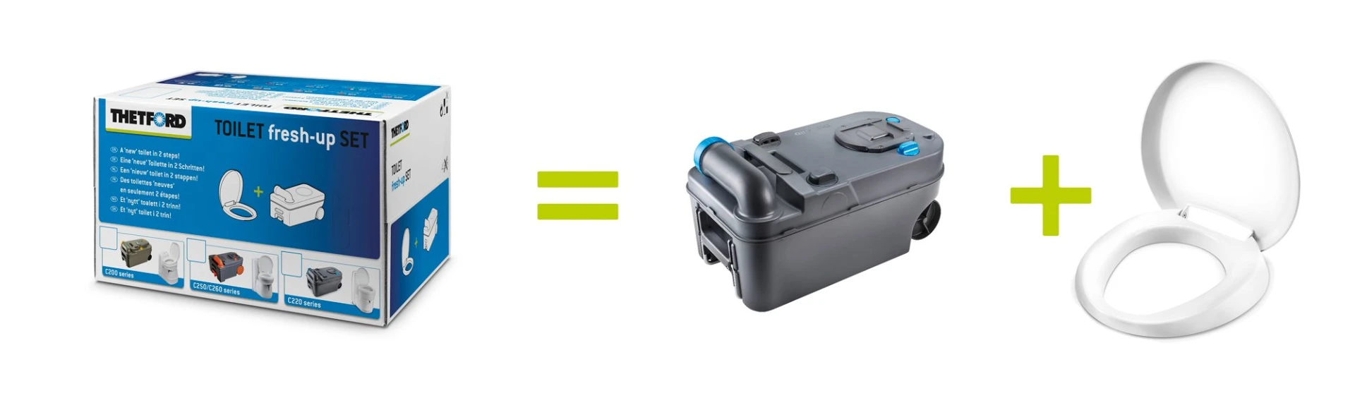 Das Toilet fresh-up Set ist eine einfache und preiswerte Möglichkeit, eine gebrauchte Cassettentoilette rundzuerneuern. Gebrauchte Reisemobile, Wohnwagen sind nicht immer in einem tadellosen Zustand, durch das Angebot von Thetford, haben sie auf einfache und günstige Weise eine "neue" Toilette. Mit dem Fresh-up Set erhalten alte Toiletten wieder einen neuen Glanz. Dieses Angebot kann auch Besitzer von Reisemobilen/Wohnwagen, die über die Anschaffung eines neuen Tanks nachdenken, dazu bewegen, das Fresh-up Set zu kaufen. Das spezielle Angebot beinhaltet: Sitz & Deckel und einen Fäkalientank.
