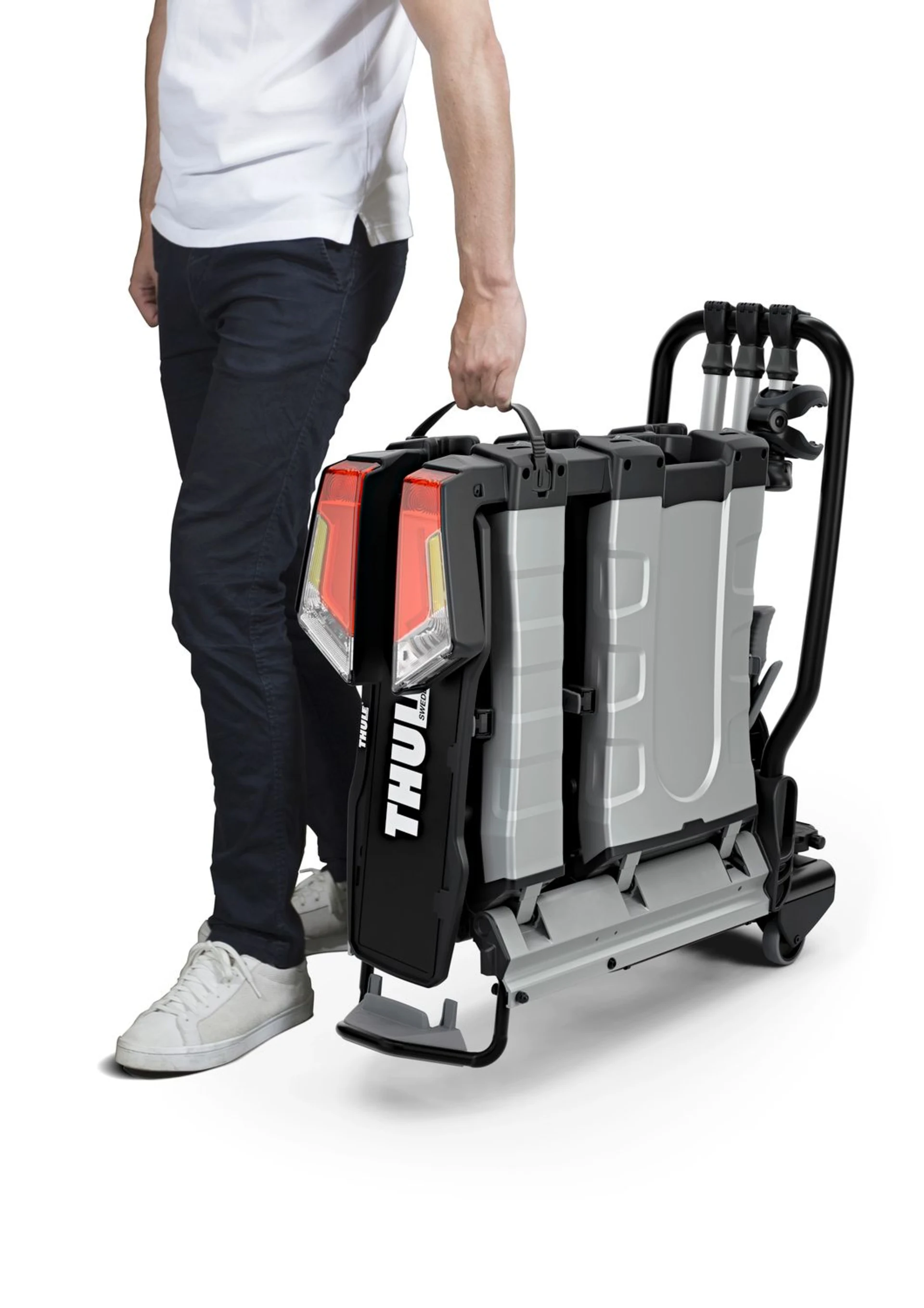 - Ergonomischer Transport des Fahrradträgers dank integrierter Transporträder und Tragegriffe