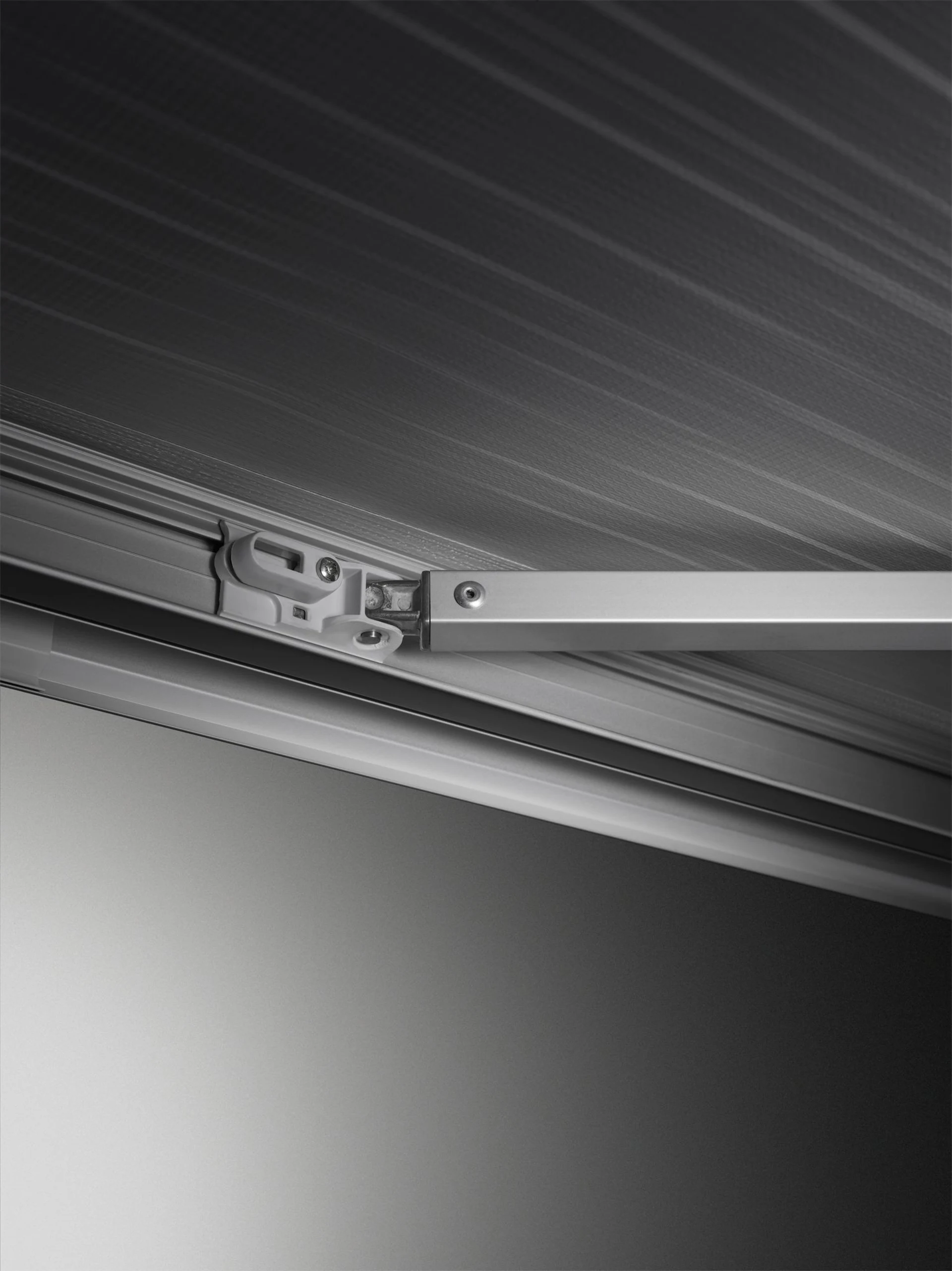 Das Frontprofil ist mit einer Rinne versehen, die Wasser und Schmutz auffängt. Inkl. zwei Halteklammern zur Aufbewahrung der Kurbel.