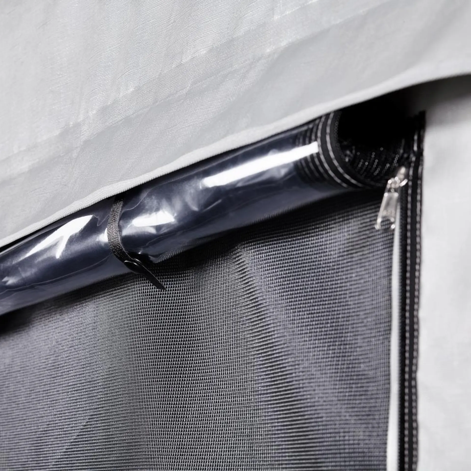 Die Seitenfenster sind von außen mit einer hochwertigen, leicht mittels Reißverschluss zu öffnenden Fensterfolie ausgerüstet. Zum Insektenschutz ist eine Fliegengaze auf beiden Seitenwänden serienmäßig.