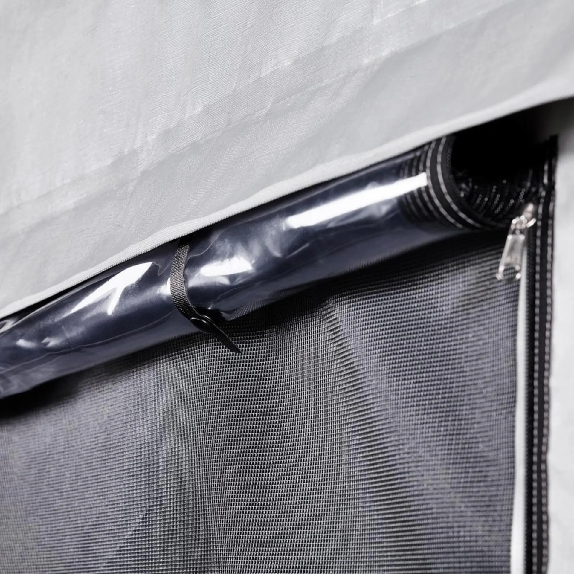 Die Vorderwand wird in die Frontleiste der Markise eingeschoben und mit einem Klemmprofil wird das Makisentuch an der Seitenwand befestigt. Die Seitenfenster sind mit Moskitonetz ausgestattet und können mit externen transparanten Vörhange mit Reißverschluss geöffnet werden. Die Vorderwand ist mit Türöffnung rechts oder links erhältlich. Große Fensterflächen lassen viel Licht herein und vermitteln ein richtiges Draußengefühl. Die Vorderwand kann komplett hochgerollt werden. Integrierte Kederseele an die Vorderwand der Zelt für optionales Zubehör (Thule Sun Blocker G2 Vorderwand). Dauerbelüftungsöffnung auf beiden Seiten