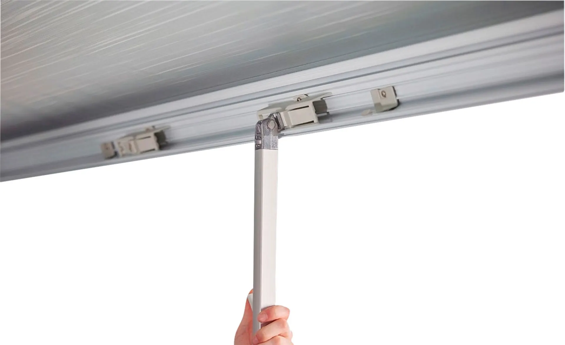 Quick Release Stützfüße sind sehr einfach zu entriegeln und unterzubringen in der Frontleiste der Markise. Die Stützfüße schwenken vertikal aus der Frontleiste, um Beschädigungen an der Fahrzeugwand zu vermeiden. Der innere Teleskoparm ist während des Ausschwenkens im Stützfuß integriert.