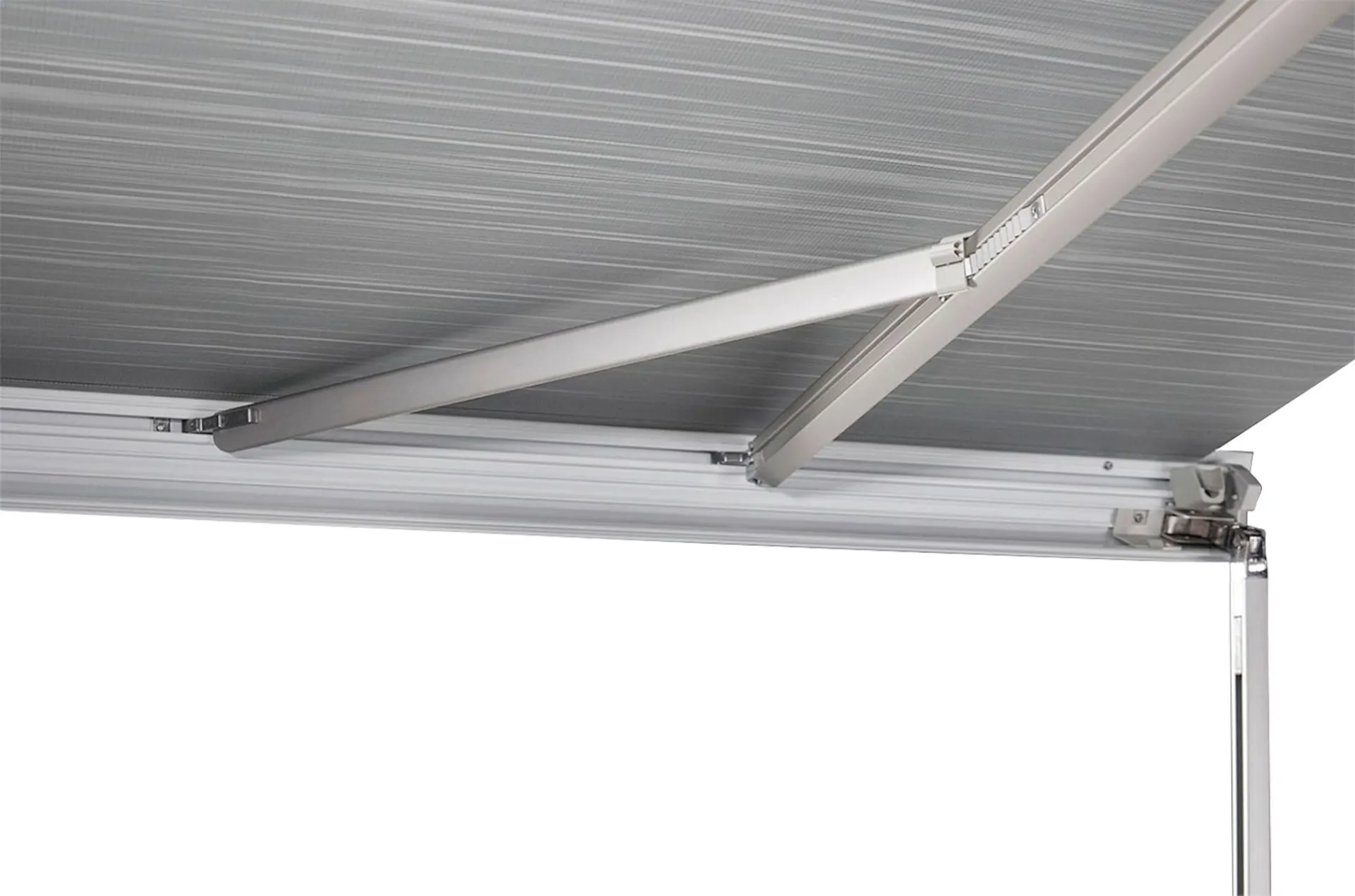 Die robusten Spannarme sorgen für eine perfekte Tuchspannung und erhöhte Windbeständigkeit. Die Spannarme sind integriert für Markisen ab einer Länge von 4,00 m, bei kürzeren Längen sind diese ein optionales Zubehör.