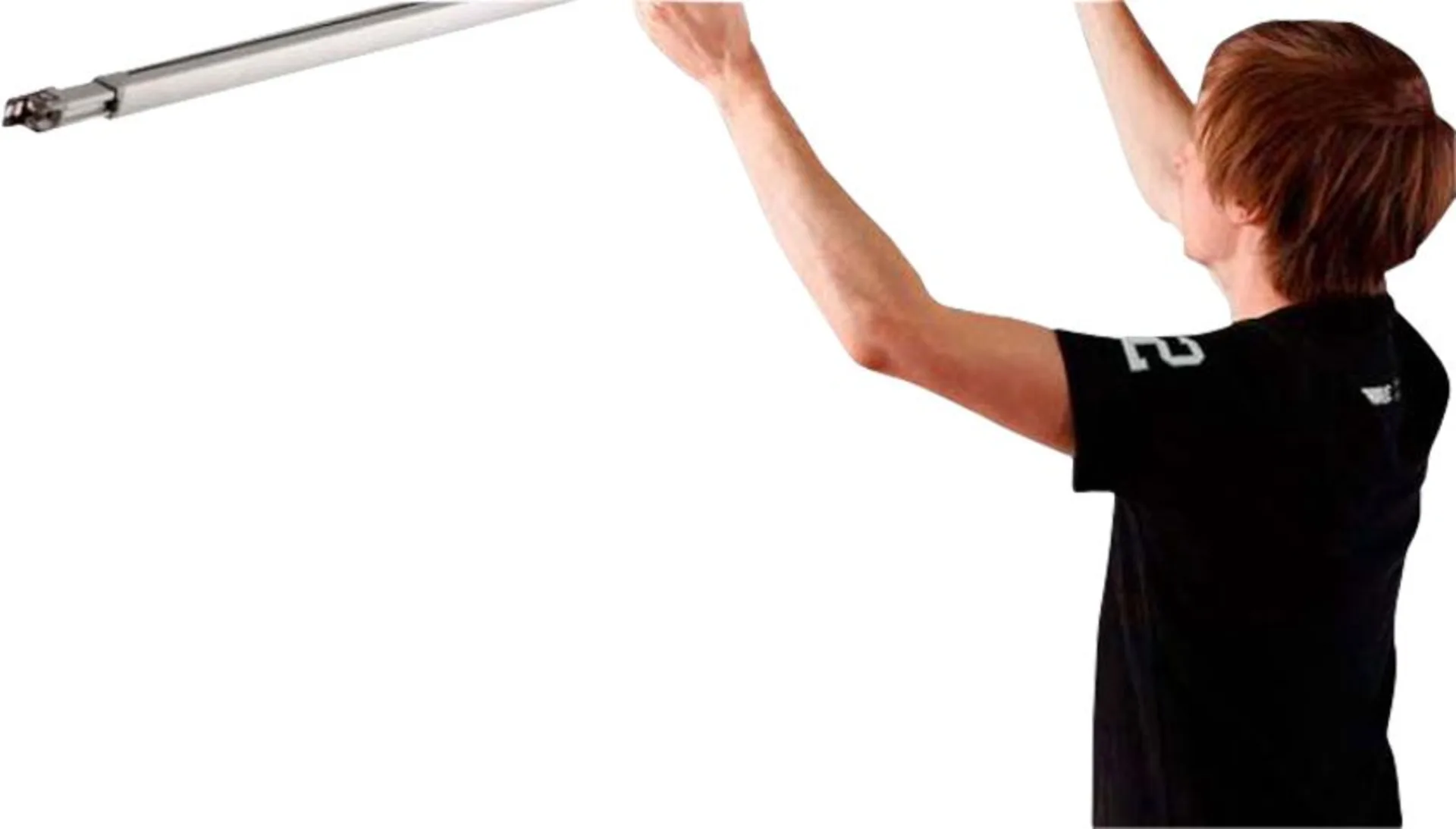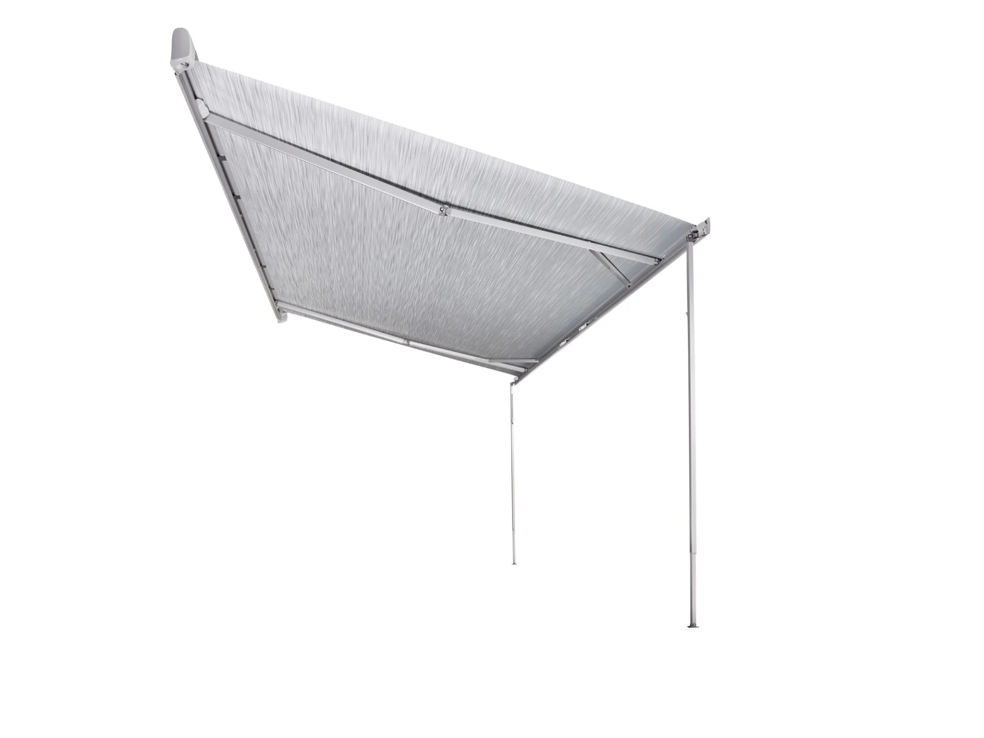 Quick Release Stützfüße sind sehr einfach zu entriegeln und unterzubringen in der Frontleiste der Markise. Die Stützfüße schwenken vertikal aus der Frontleiste, um Beschädigungen an der Fahrzeugwand zu vermeiden. Der innere Teleskoparm ist während des Ausschwenkens im Stützfuß integriert.