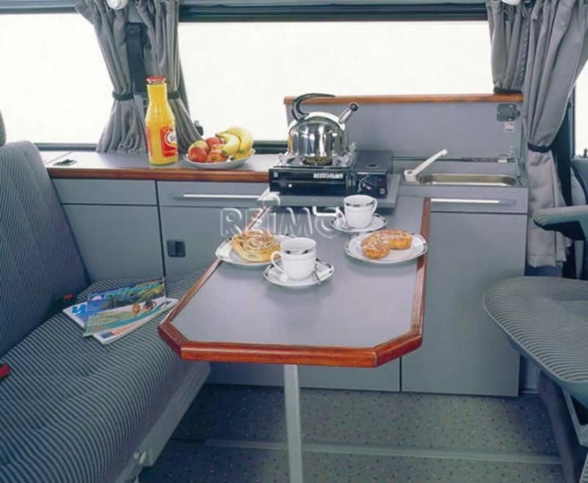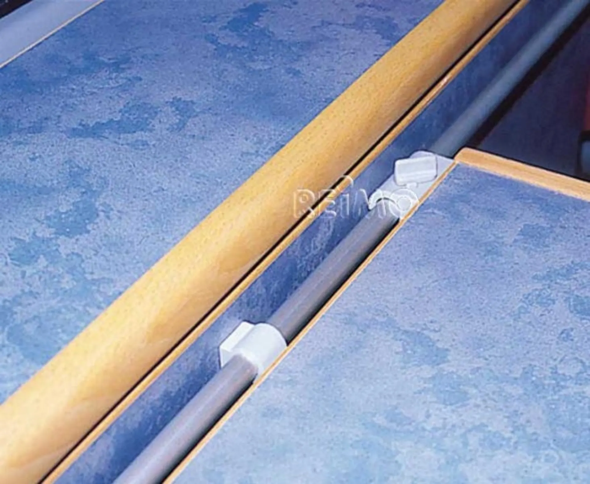 Tischgleitschienen mit Edelstahl-Aufnahmerohr zum Aus- bzw. Einhängen oder Verschieben des Tisches. Arretierbare Verschiebesicherung, Tischschiene beliebig kürzbar. Leichter Zugang zu Sitzbänken und zu Staukästen durch Verschieben oder Aushängen der Tischplatte, schneller Bettenbau.