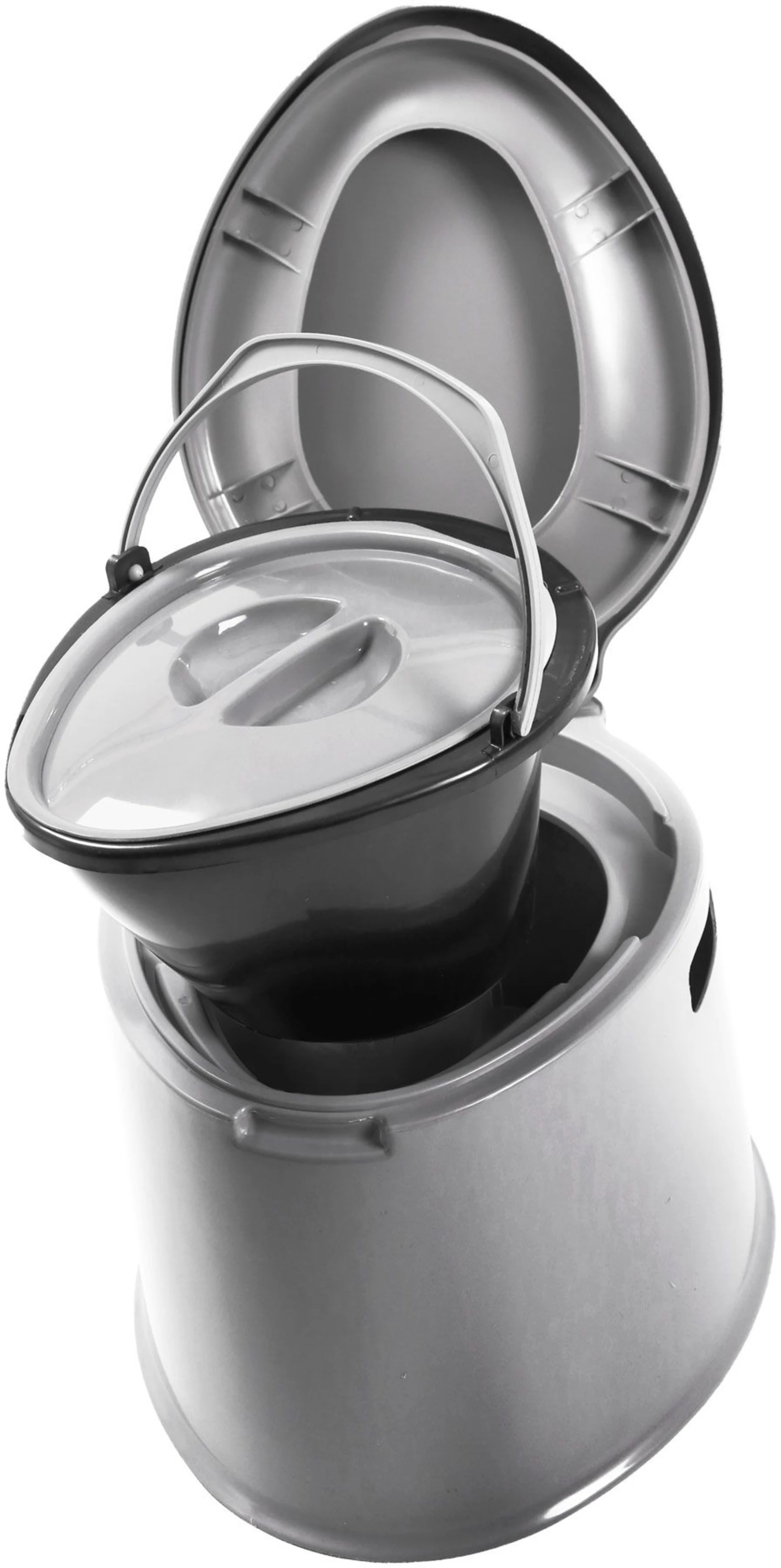 Moderne, tragbare Toilette mit komfortabler Sitzhöhe und vielen funktionellen Details. Neu gestalteter Toilettenkörper aus stabilem, langlebigem Hartkunststoff. Sofort einsatzbereit da installationsfrei. Die umweltfreundliche und kostengünstige Alternative zu herkömmlichen Chemietoiletten.