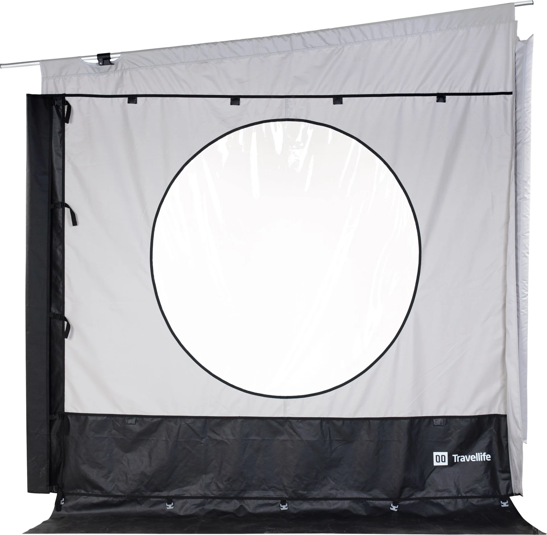 Die Seitenwand bietet Schutz vor Wind und Regen und erweitert Ihren Wohnraum. Das große Fenster in runder Form gewährleistet, dass viel Helligkeit und einen ungehinderten Blick nach außen.