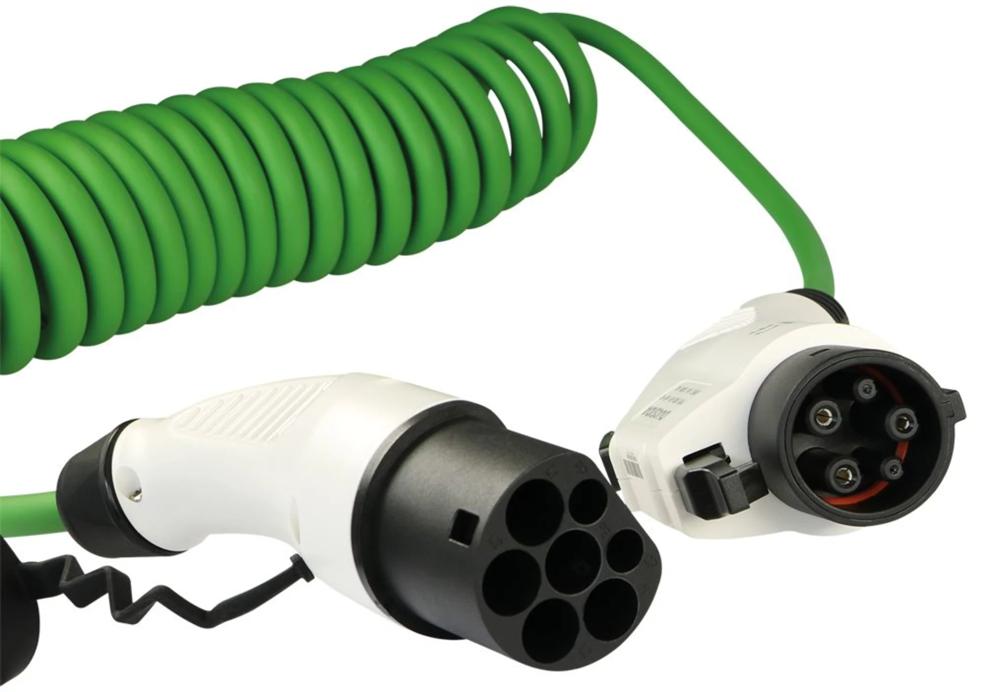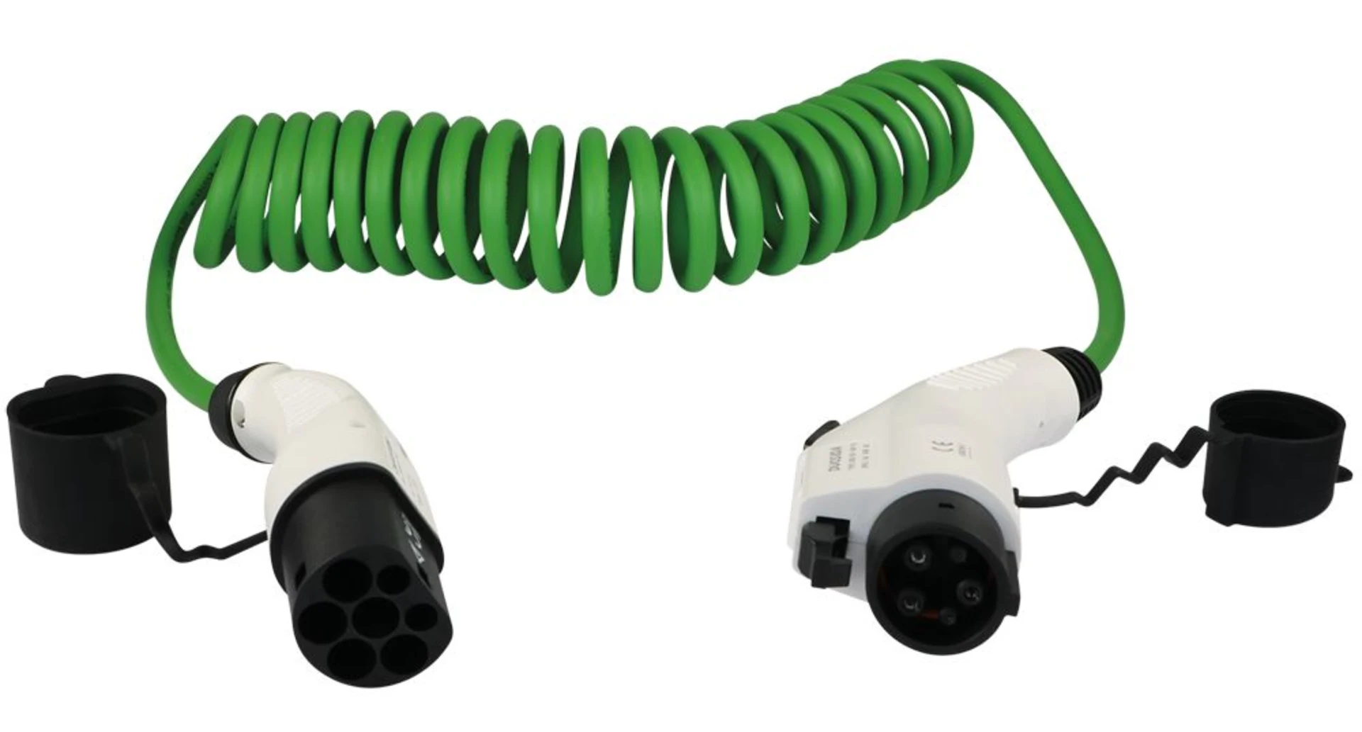 Mode 3 Spiral-Übergangs-Ladekabel für Elektro-Fahrzeuge mit Typ 1 Steckdose. Sehr robustes, flammwidriges PUR Spiral-Kabel mit Typ 2-Stecker und Typ 1-Kupplung (Stecker und Kupplung geschraubt). Die Ladung erfolgt 1-phasig (230 V). Kabelquerschnitt 2.5 mm2.