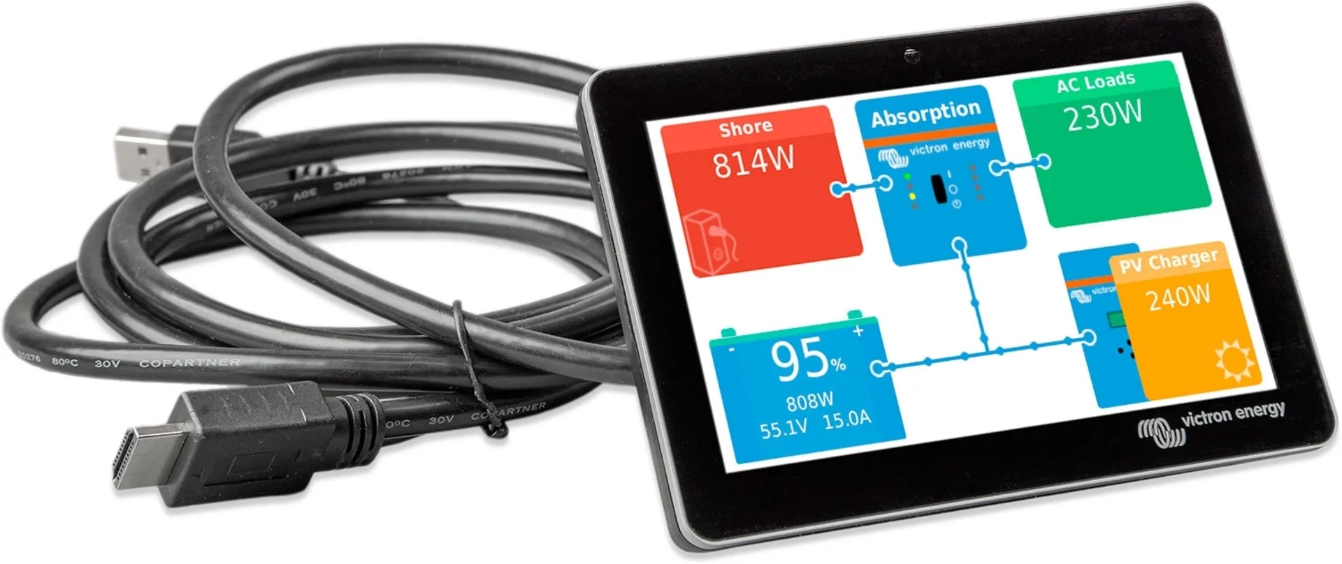 GX Touch 50 und GX Touch 70 sind Bildschirme für unseren Cerbo GX. Die fünf- und siebenzölligen Touchscreen-Bildschirme bieten einen sofortigen Überblick über Ihr System und ermöglichen die Anpassung von Einstellungen im Handumdrehen. Sie werden einfach mit einem Kabel an den Cerbo GX angeschlossen. Ihr superschlankes, wasserdichtes Design, der Aufbau von oben und die einfache Installation bringen viel Flexibilität beim Aufbau eines klaren und sauberen Armaturenbretts.