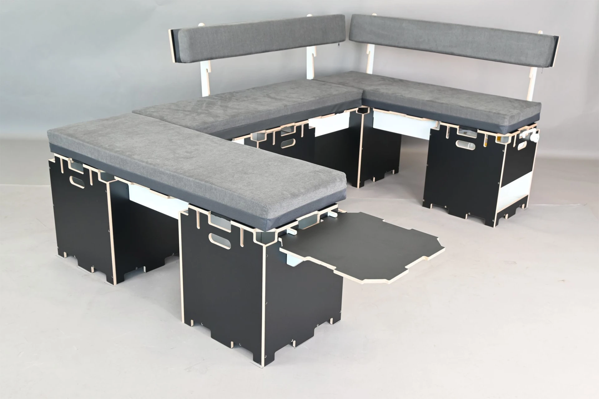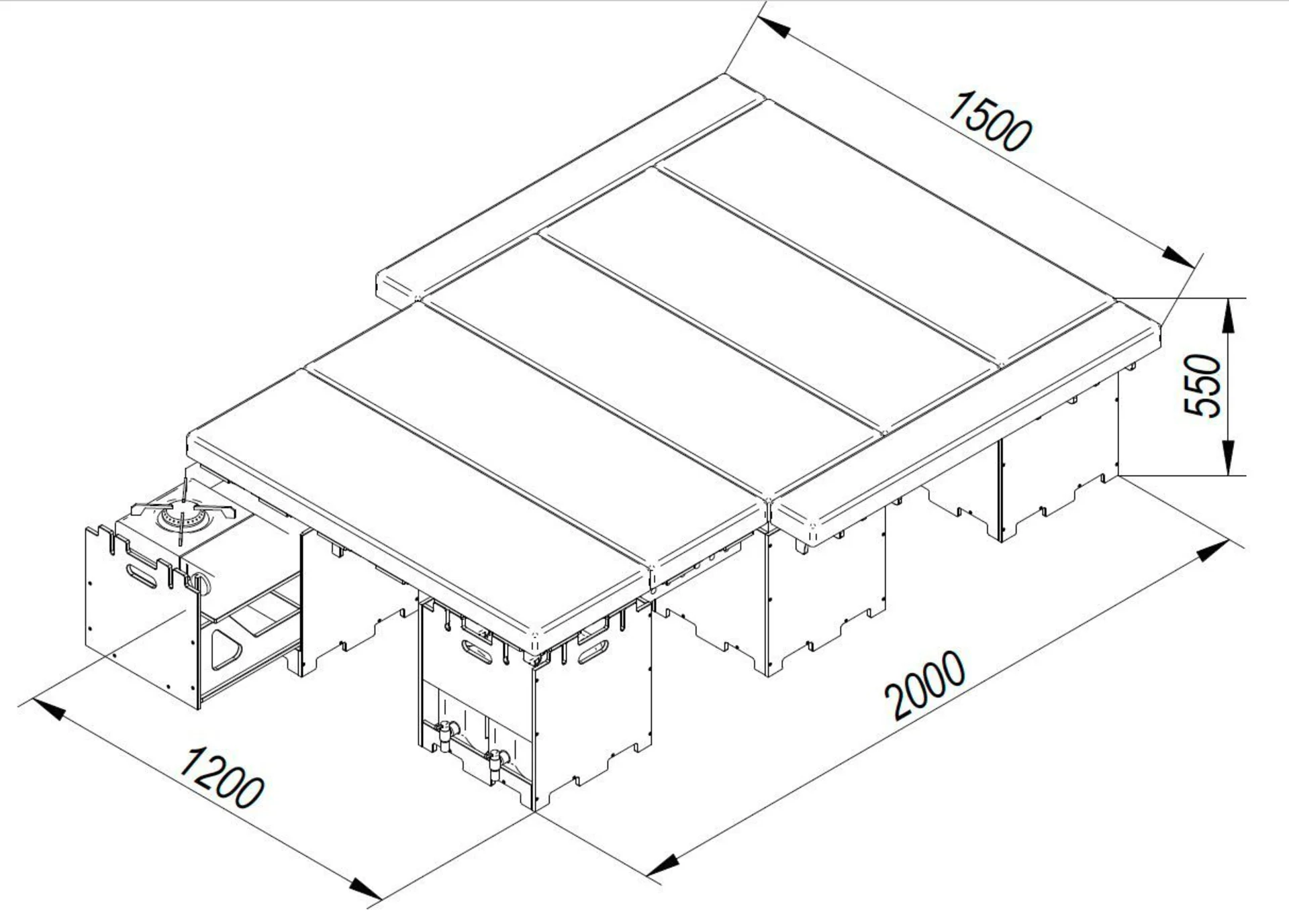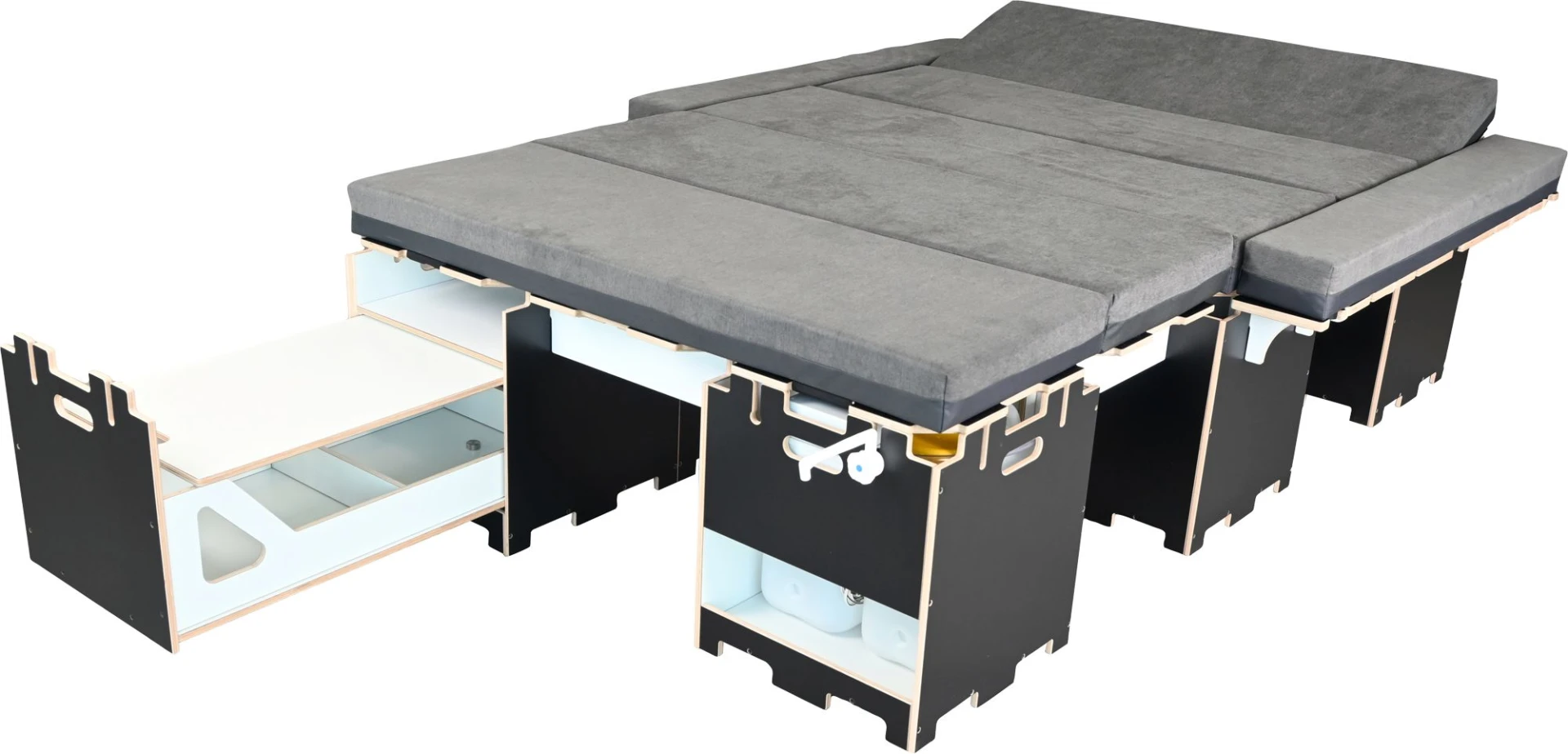 VOJO ist ein Built-in-System, das aus einem Set modularer Boxen besteht, die ganz einfach wie Bausteine im Stecksystem-Prinzip mit Holzverbindungsstücken ohne Werkzeug miteinander verbunden und kombiniert werden können. Dadurch ist sie vielseitig einsetzbar: ob als Campingbox im Auto für dein nächstes Abenteuer, als Sitz- oder Wohnbereich im oder vor dem Fahrzeug, Gästebett für Besucher, Kinderzimmermöbel zur Aufbewahrung, als Gartenmöbel, zum Aufbau eines Tresens oder sogar als Homeoffice-Arbeitsplatz und Aufbewahrungsmöbel für Ausrüstung oder Werkzeugen in der Garage.