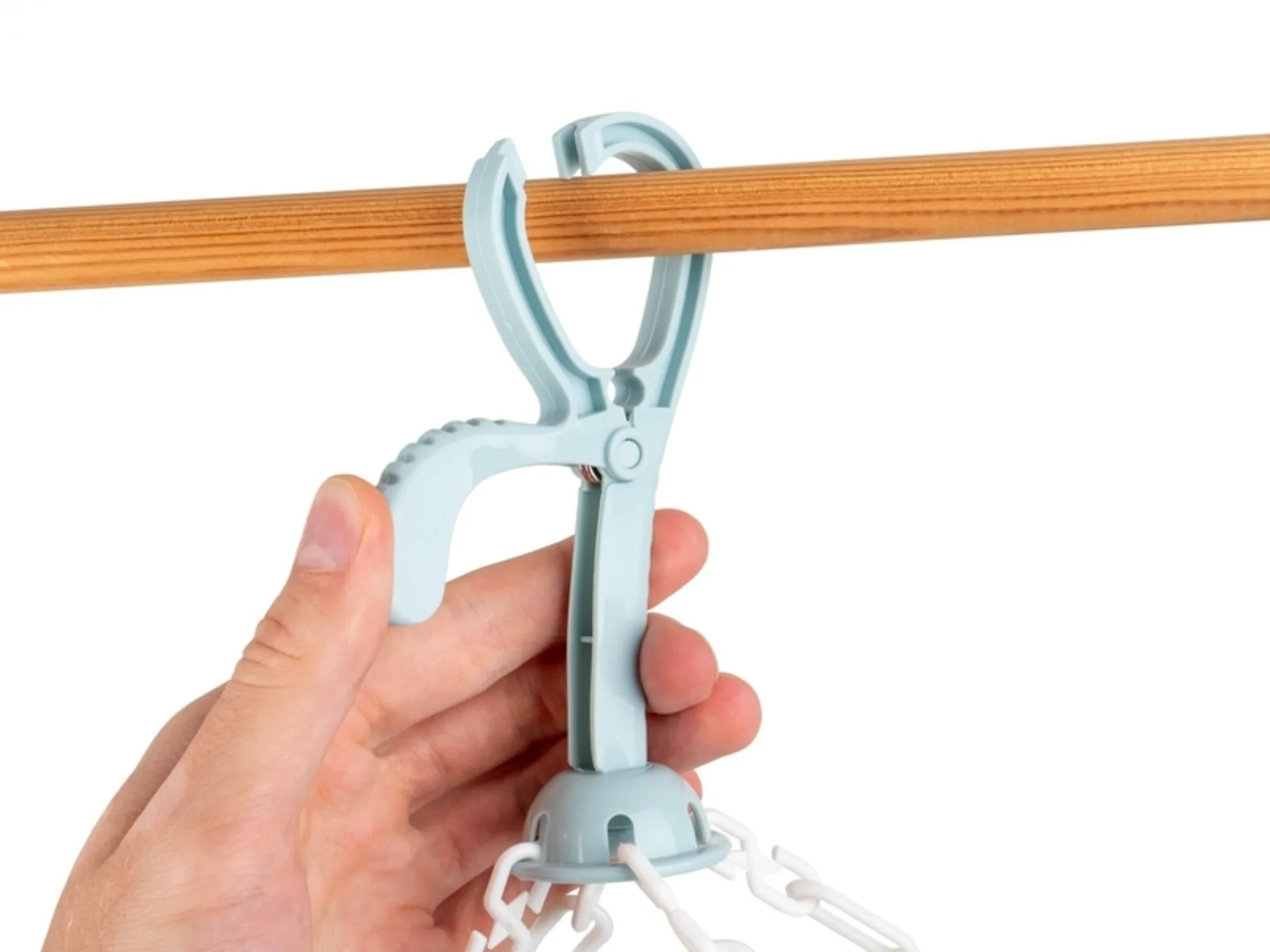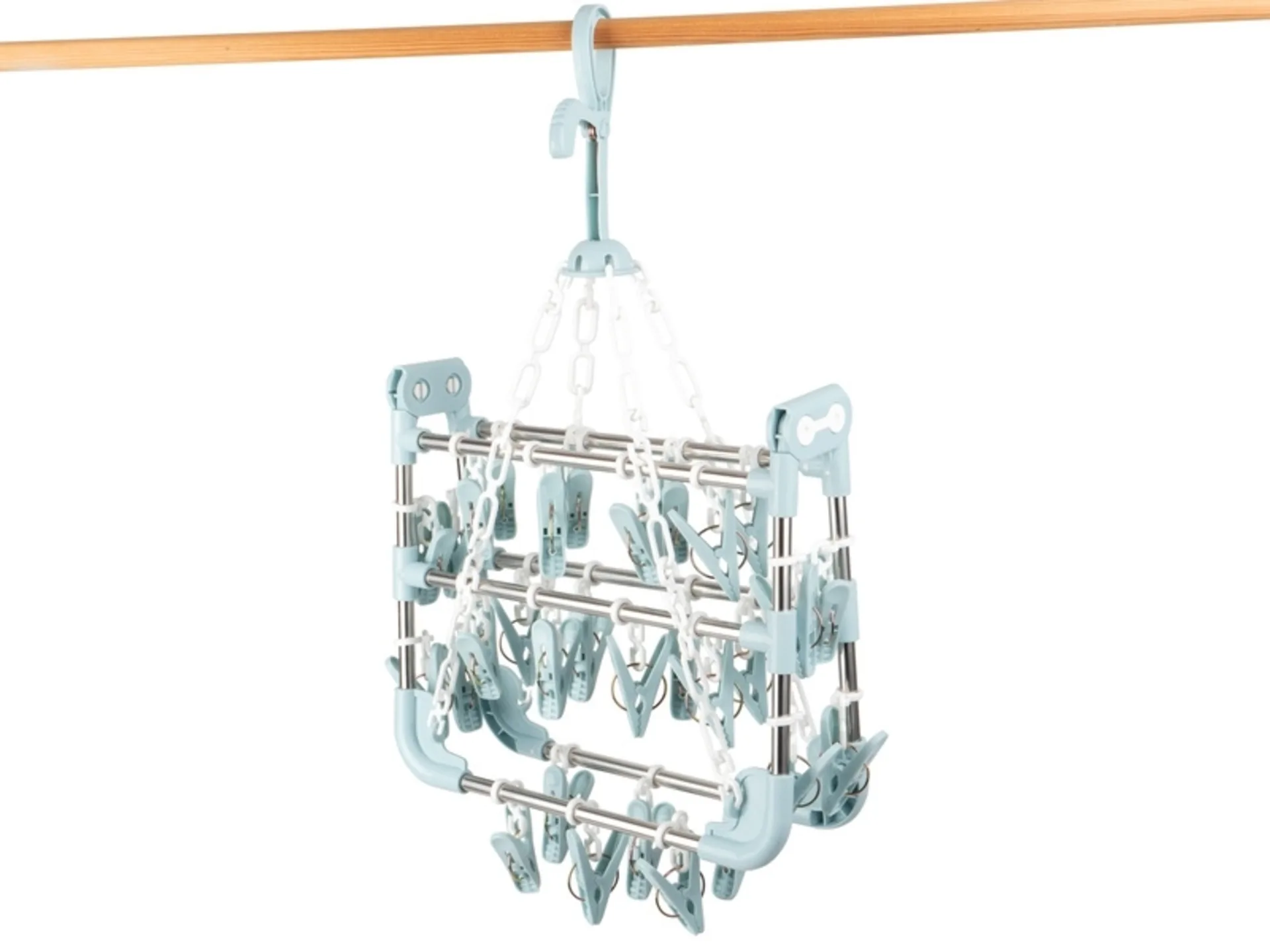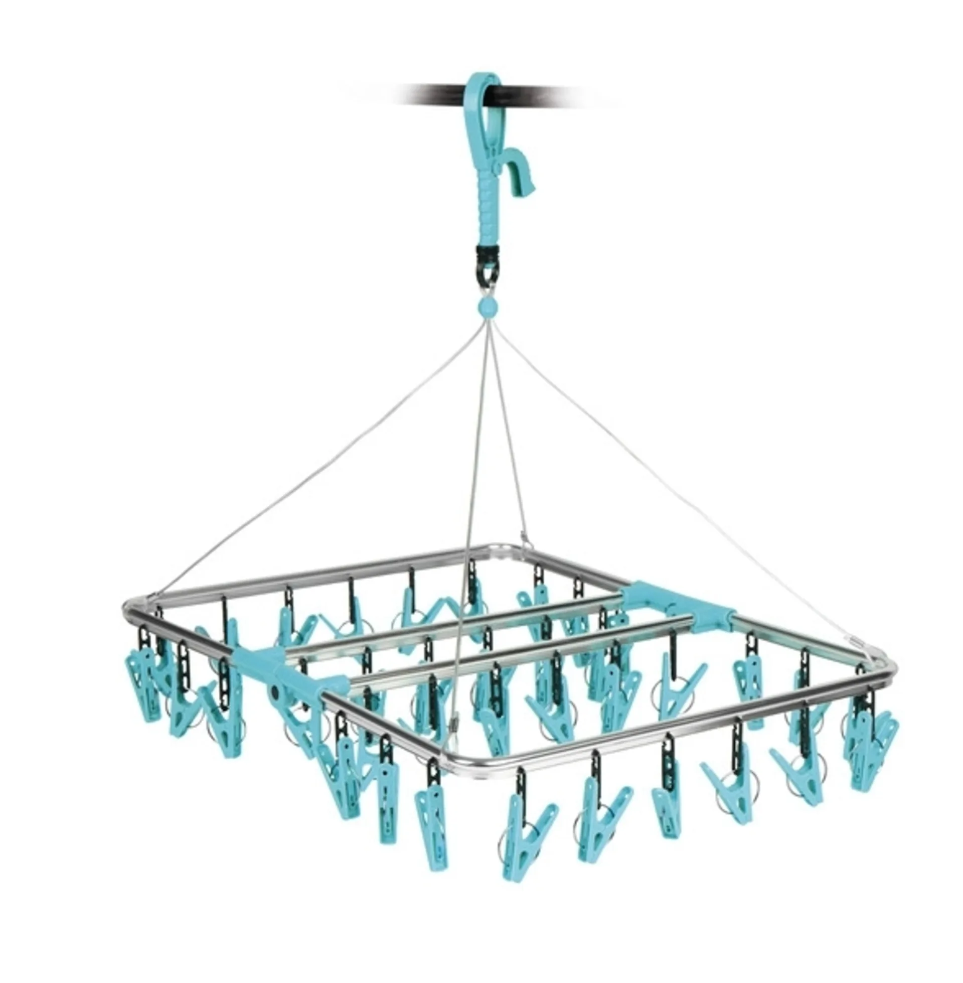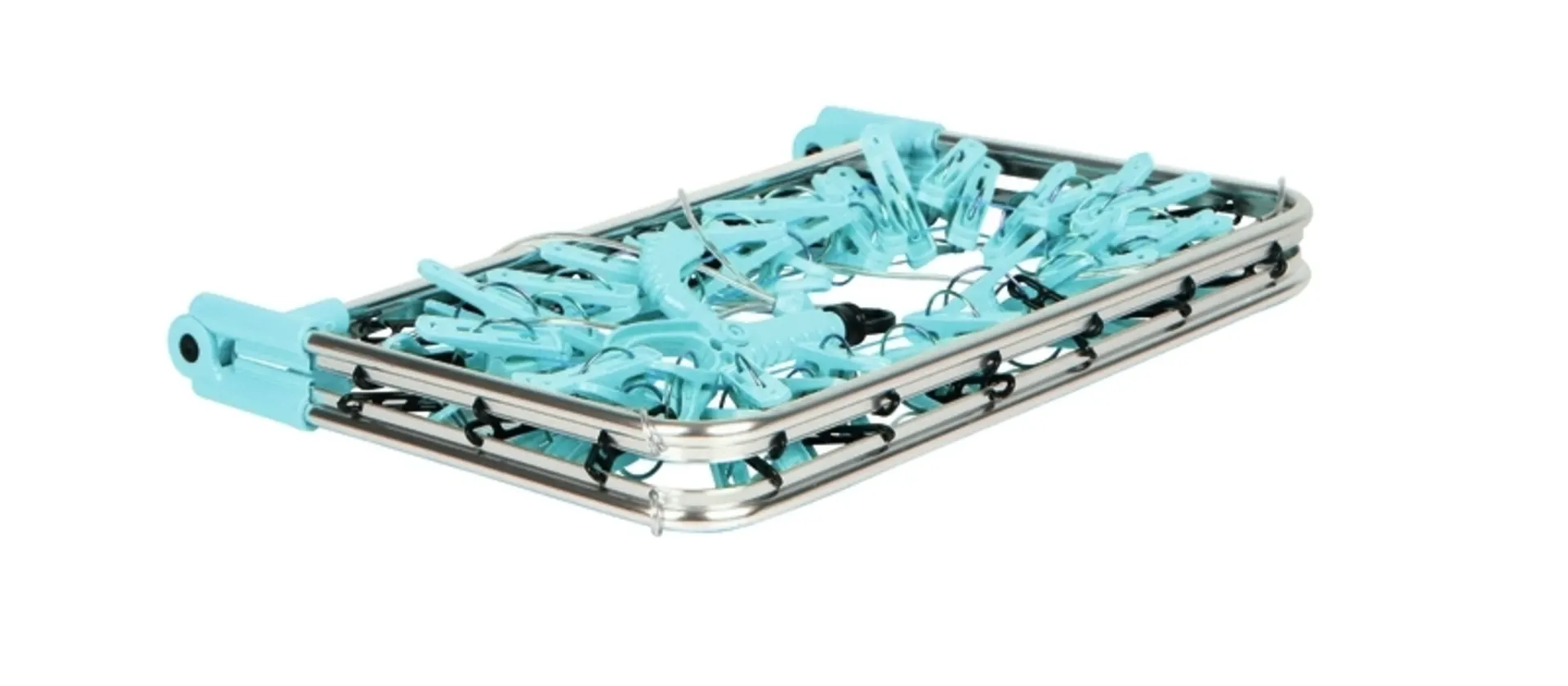 Wäschetrockner Olli wird zusammengeklappt und hat somit ein kleines Packmaß. Die 30 Klammern bieten viel Platz für Ihre Wäsche. Der große Kunststoffhaken ermöglicht das Aufhängen. Der Aluminium-Rahmen und die hellblauen Klammern vermitteln Campingfeeling. Maße geöffnet: 37x54cm, Maße gefaltet: 37x27cm.