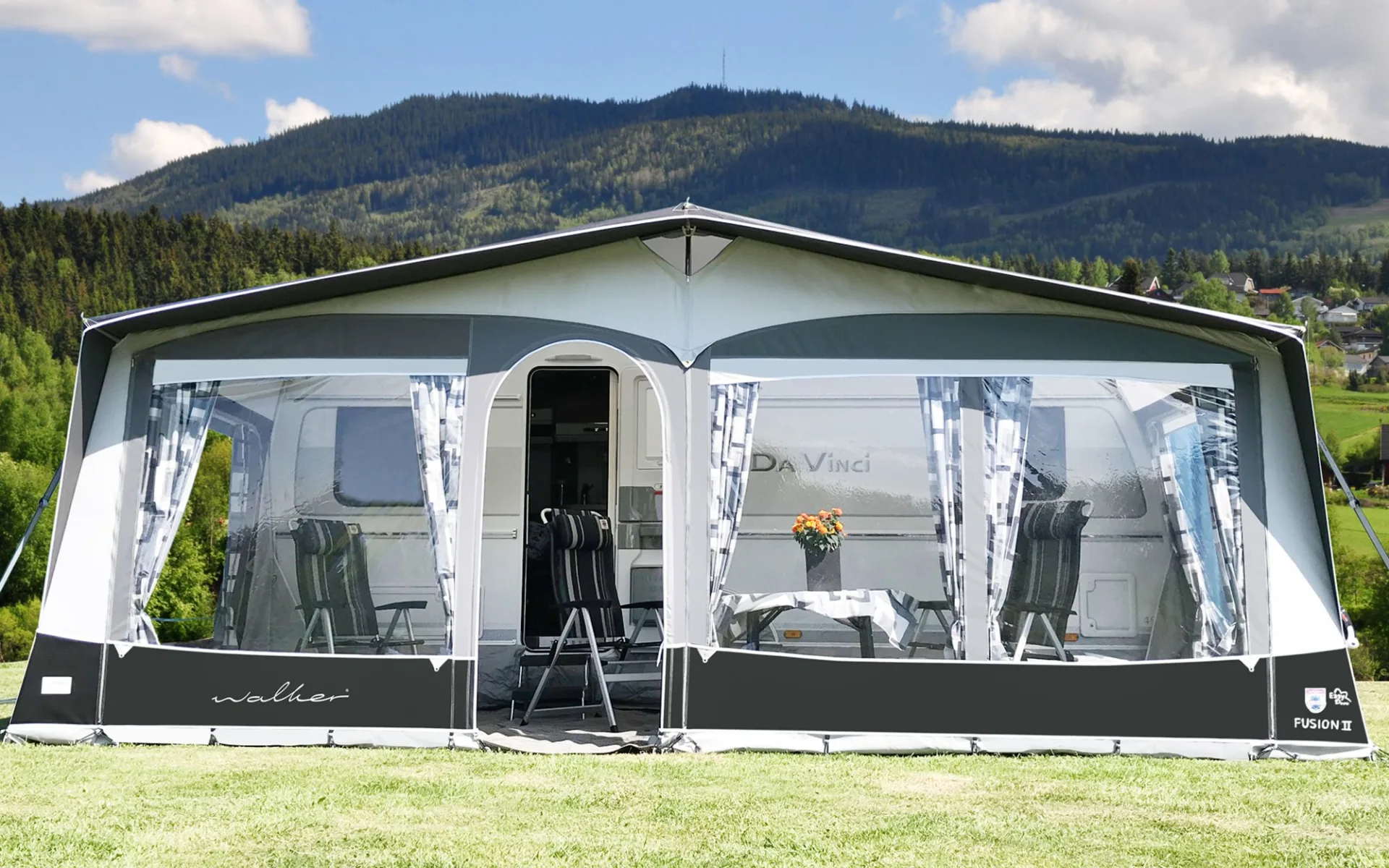 Die tauschbaren Vorderwandhälften, Easy-Door, ermöglichen einen variablen Eingang. Serienmäßig wird das Fusion II/240 mit einem Stahlgestänge ausgeliefert. Als optionelles Zubehör gibt es ein 28mm Aluminiumgestänge mit Easy-PowerGrip oder ein Glasfibergestänge. Für beide Seiten gibt es die Möglichkeit einen Anbau zu montieren. Der Anbau wird mittels Reißverschluss montiert, wobei die Seitenwand des Vorzeltes als Trennwand montiert werden kann. Alle Walker-Anbauten haben einen Extra-Eingang und Moskitofenster.