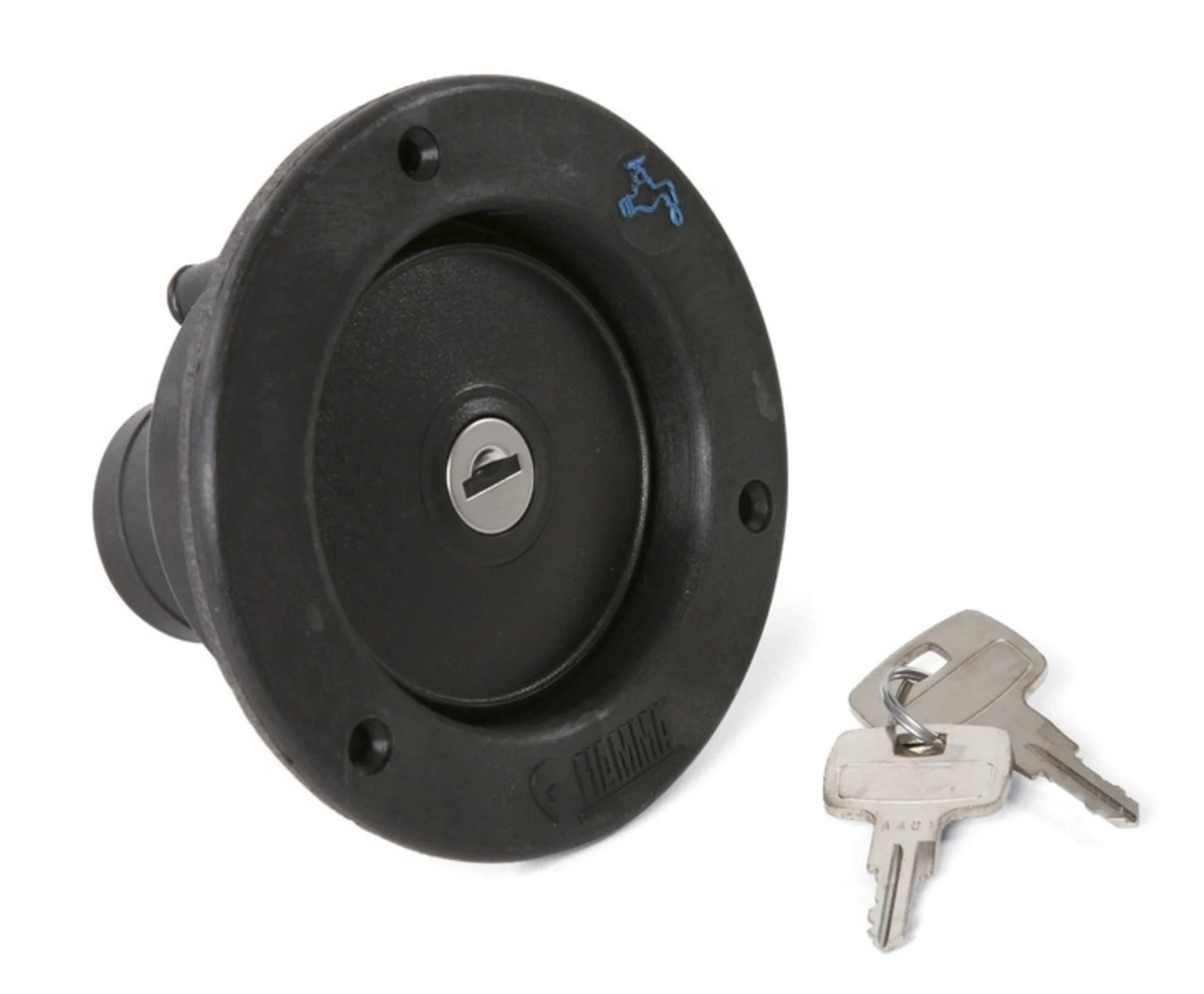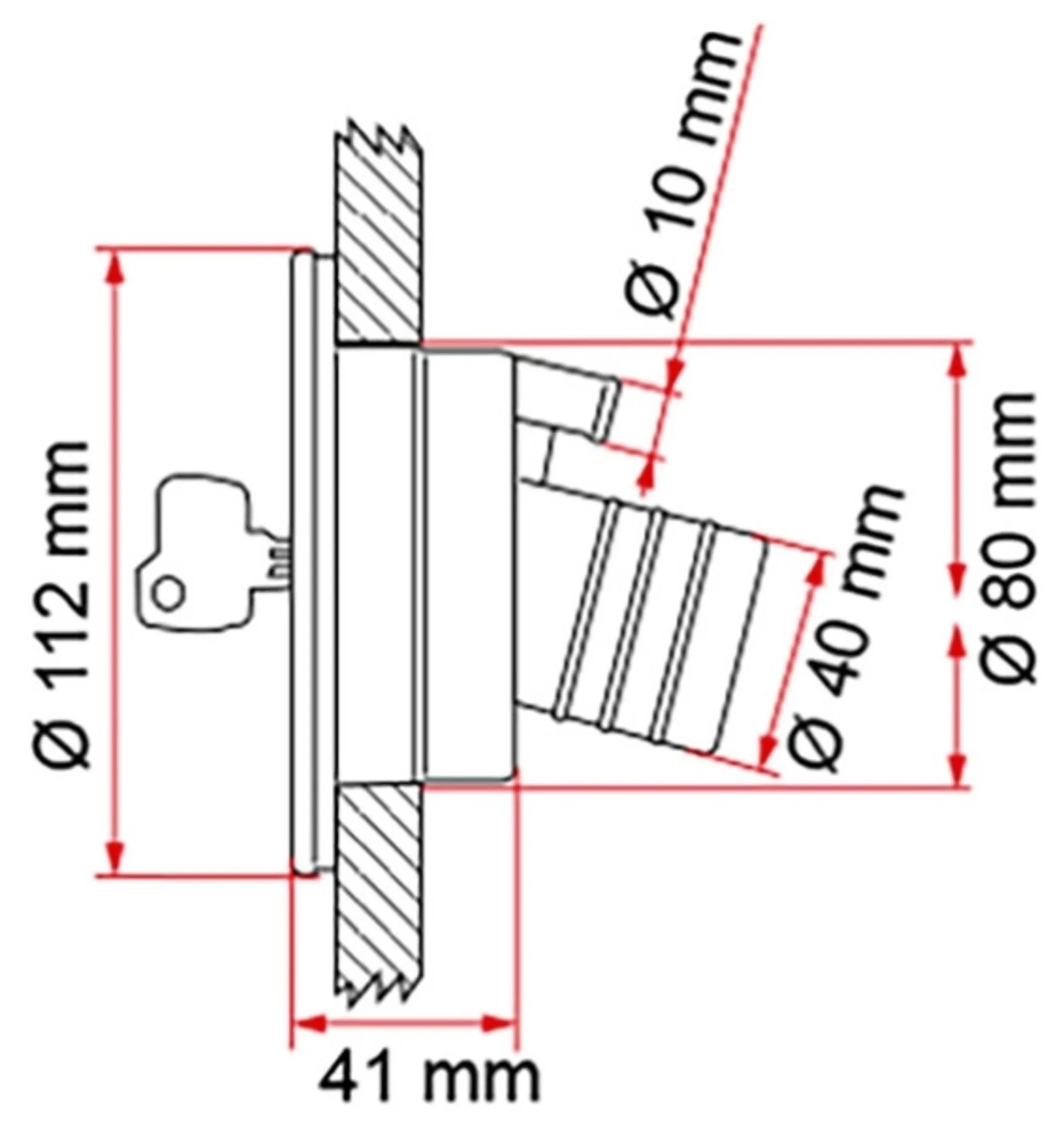 Schlauchanschluss: 40 mm, mit Schließzylinder und 2 Schlüsseln. Farbe Schwarz, Außen-Ø 112 mm