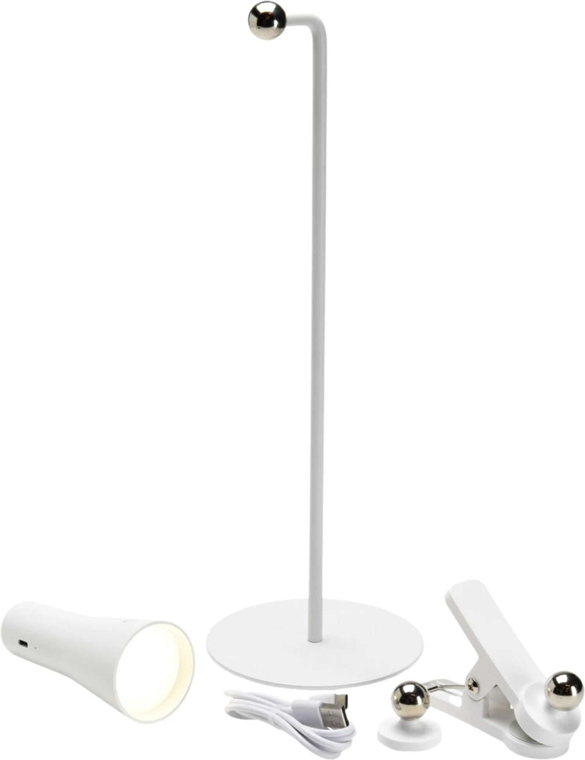 Inkl. Leuchte, Tischständer, Klemmbügel und Wandhalter.