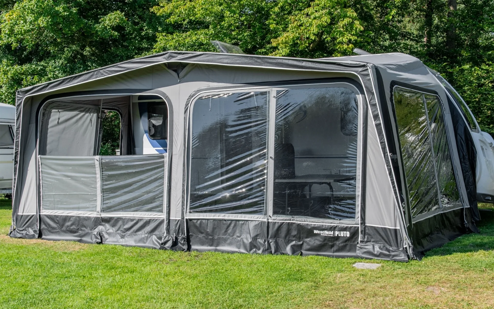 Das Vorzelt besteht aus leichtem Polyester und kann leicht in die Wohnwagenschiene eingeführt werden. Der Rahmen besteht aus aufblasbaren Luftschläuchen, die fest am Vorzelt befestigt sind. Der Aufbau ist daher sehr einfach und erfordert keine lose Stangenmontage. Das gesamte Zelt kann über nur ein Ventil aufgeblasen werden, entweder manuell oder mit einer optionalen 12-V-Zeltpumpe.