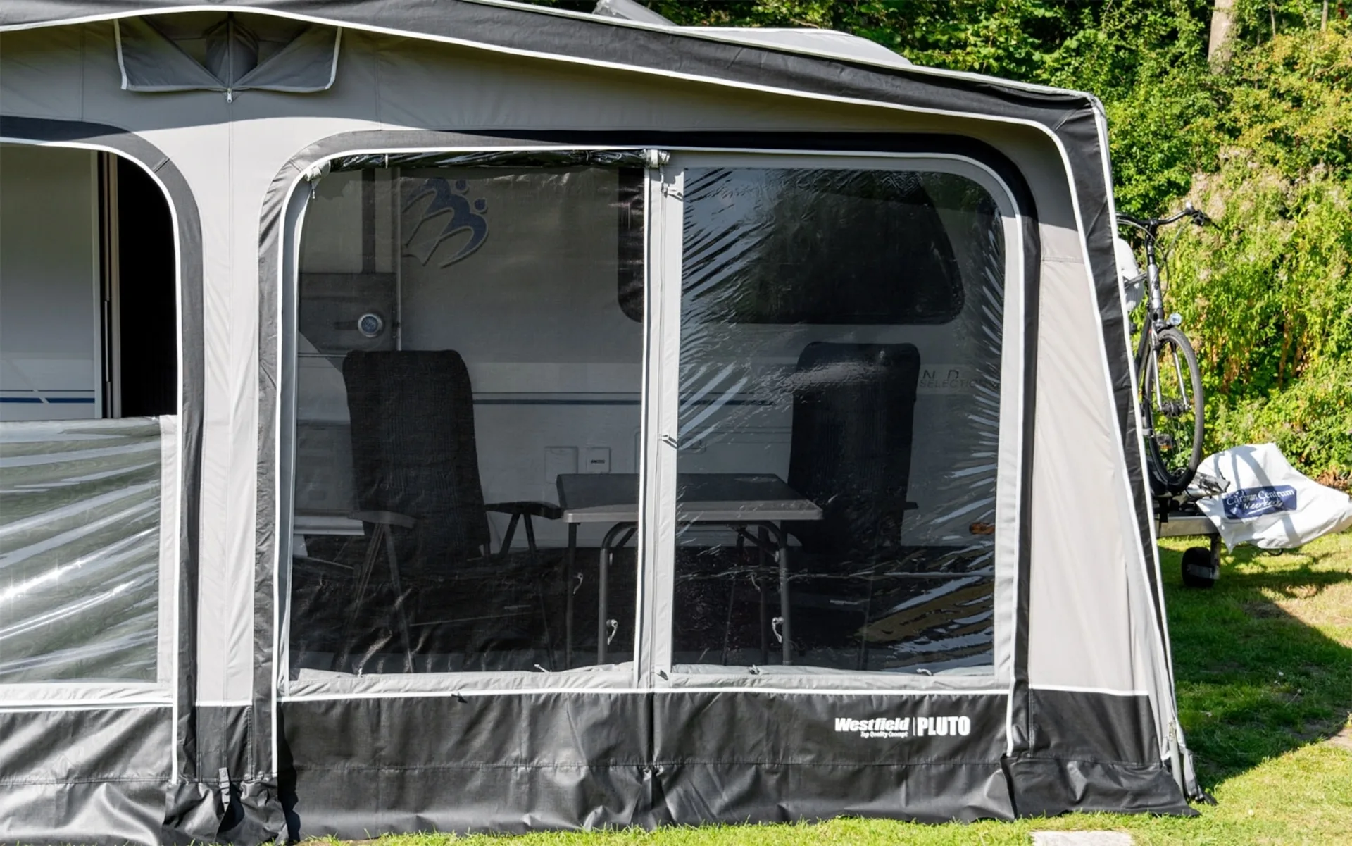 Das Pluto hat große Panoramafenster in jeder Seitenwand, die bis zur Hälfte aufgerollt werden können und als Tür verwendet werden können. Es gibt auch Belüftungsmöglichkeiten für heiße Tage, wie beispielsweise ein großes Fliegengitter mit transparenter Abdeckklappe an einem der Fenster und eine Belüftungsöffnung im First des Vorzelts, die mit einem Reißverschluss geöffnet oder geschlossen werden kann.