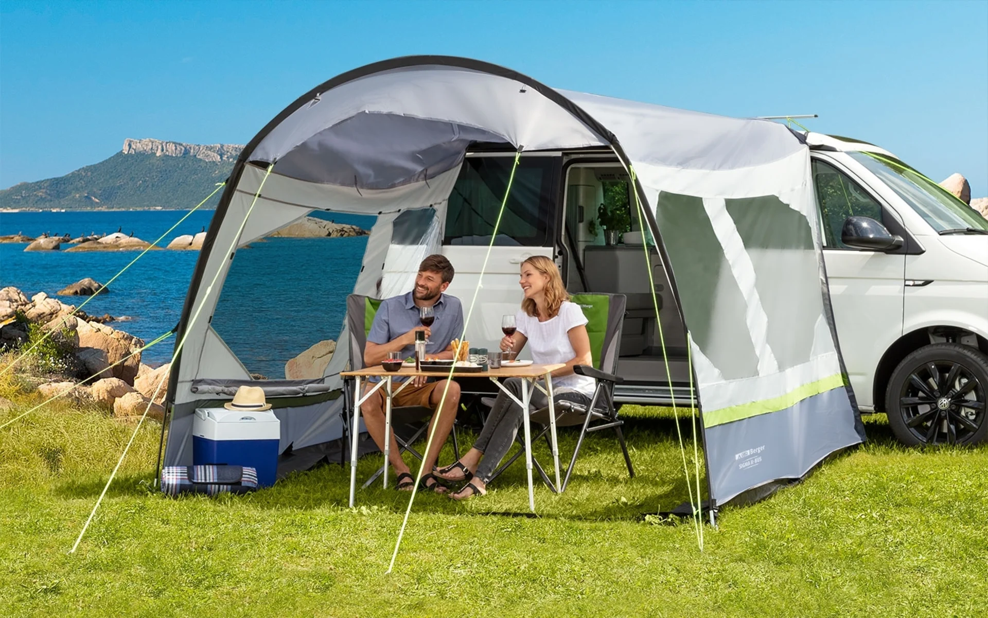 Dieses geräumige Sonnenvordach mit einer Anbauhöhe von 180 – 220 cm schützt dich vor Wind, Sonne und Regen und bietet einen UV Schutz von 50+. Die großen Fenster, welche einen guten Blick nach außen ermöglichen, können von innen blickdicht verschlossen werden, um etwas Privatsphäre zu schaffen. Das Sonnenvordach ist schnell mit nur einer Fiberglasstange aufgebaut.